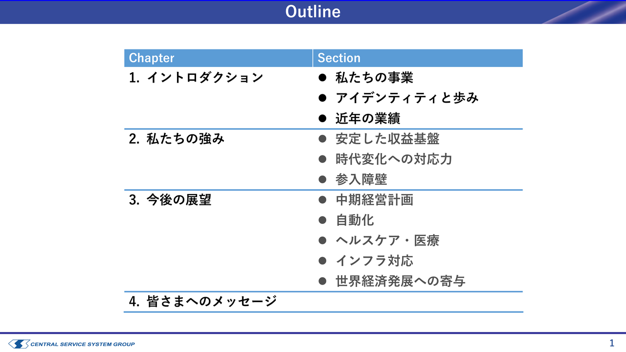 本日の目次はスライドのとおりです。まずは当社のイントロダクションとして概要や強みをお話しした後、今後の展望として成長戦略などについてご説明します。よろしくお願いします。