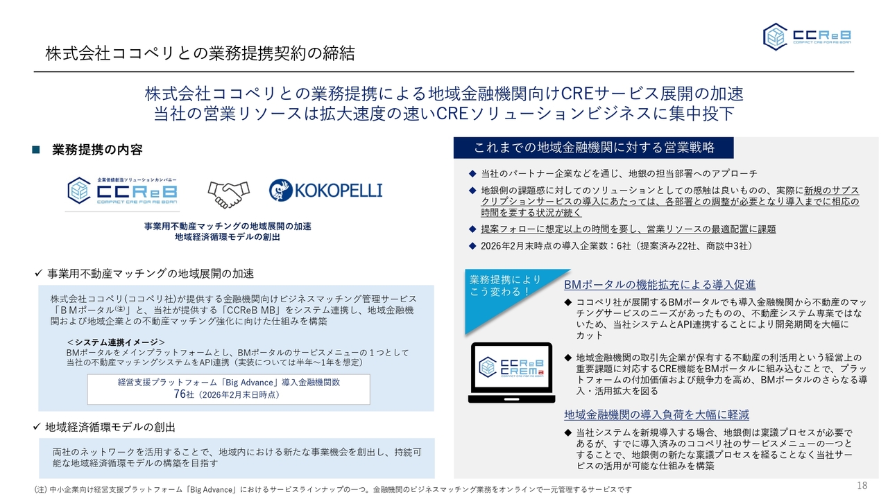 この「BMポータル」は、ココペリ社の中小企業向け経営支援プラットフォーム「Big Advance」におけるラインナップの1つとなります。「Big Advance」は、すでに76社の金融機関に導入いただいており、導入企業に当社のサービスを提供できる機会をいただきながら、両社のネットワークを使って、地域内における新たな事業機会を創出していこうということで、地域経済の循環モデルを両社で目指していくというところが、提携の目的となっています。