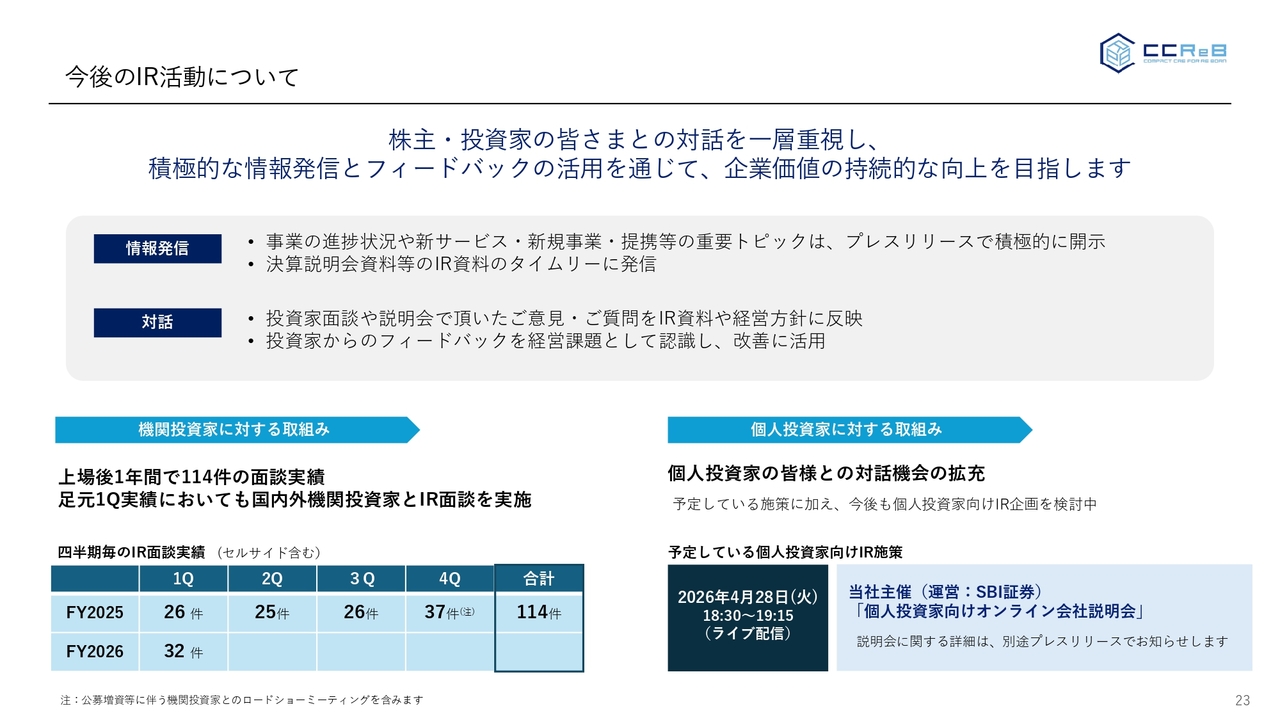 一方で、個人投資家に対しても、今回4月28日にSBI証券が運営する個人投資家向けのオンライン会社説明会を行います。このような場を通じて、当社をしっかり発信していきたいと思っています。