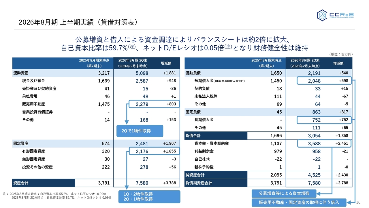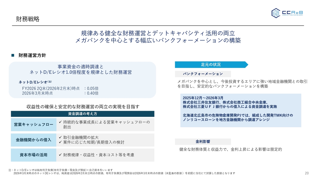 資金調達についても、足元、上場による信用力は強くなっており、第2四半期ではありませんが、3月に新たに2行の金融機関を招聘しました。また、地域金融機関との取引も今後拡大すべく交渉している状況です。引き続き、ネットD/Eレシオ1.0倍という財務規律を持ちながら運営を行っていきます。