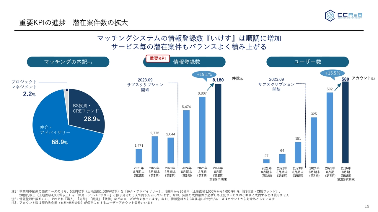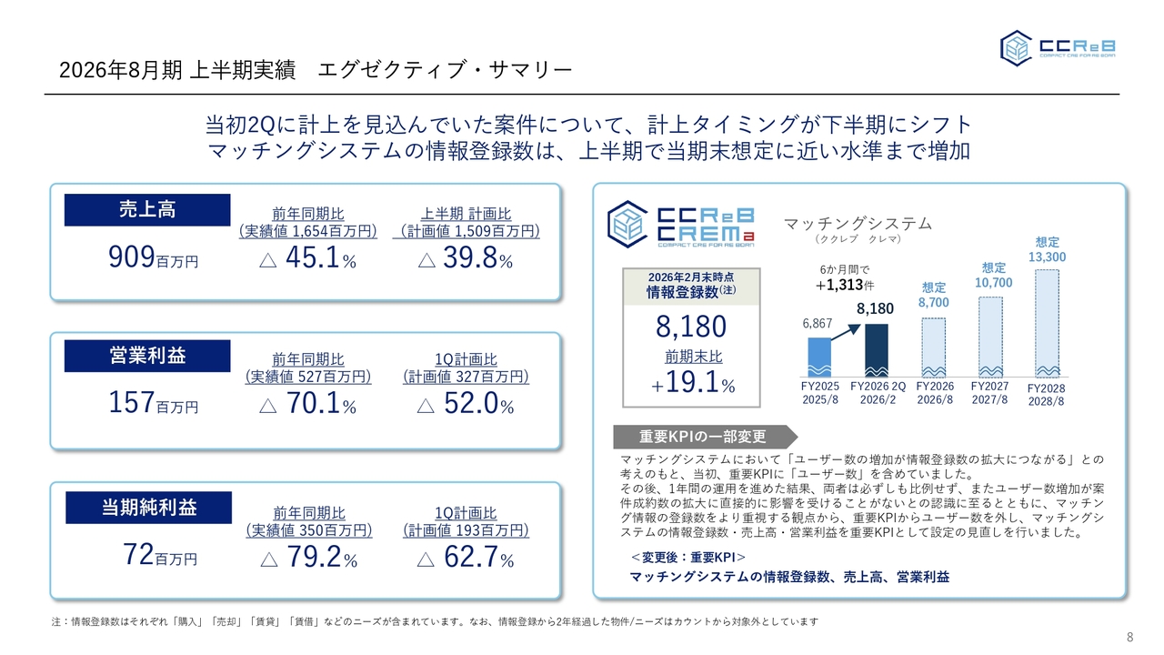一方、当社ビジネスの根源であり重要KPIであるマッチングシステムの情報登録数です。こちらは、非常に好調に推移をしており、期末である2026年8月末時点の情報登録数を8,700件と想定していましたが、第2四半期末時点で8,180件まで伸びている状況です。