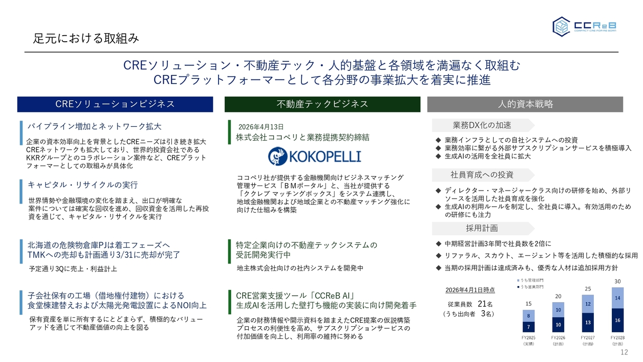 各ビジネスの進捗です。今回一番大きいトピックスとしては、株式会社ココペリと業務提携契約を締結します。このココペリ社については、特に当社の不動産テックである「CCReB MB(ククレブ マッチングボックス)」の営業戦略の変更になるものです。