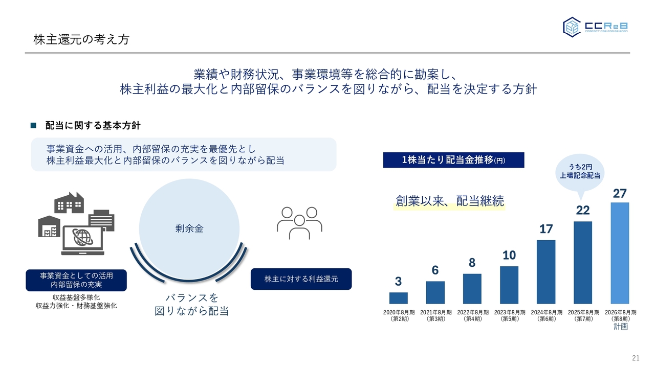 株主還元の考え方です。現時点においては、当期の1株当たり配当金は27円という計画は変えていませんが、今後、利益が増えていくということであれば増配についても検討していきたいと考えています。