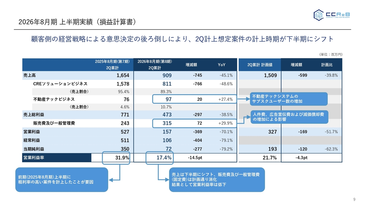 上半期実績の損益計算書です。売上高は9億900万円となり、前年同期比マイナス45.1パーセントとなっていますが、事情についてはこれまで申し上げているとおりです。