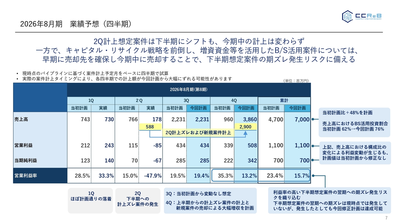 その結果、当初想定していた各サービスの売上・利益構成の組み換えによって、営業利益率の変動はありますが、B/S活用投資の売却先を確保したことで、業績見通しが明確化しましたので、今回、売上高を70億円に上方修正をすることとしました。