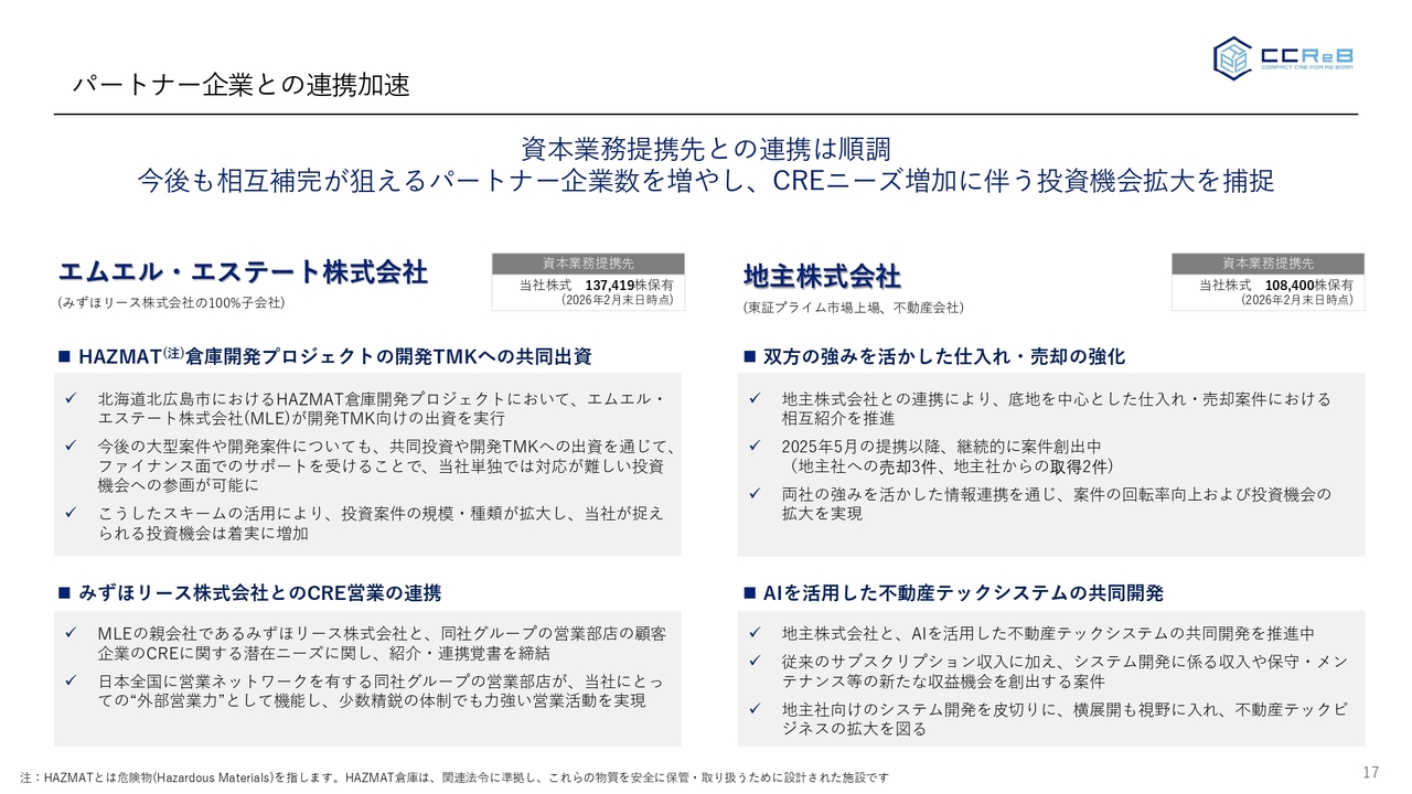 MLE社については、北広島のHAZMAT倉庫の開発プロジェクトに出資をいただいています。こちらは、当社のターゲット規模に対して非常に大きい案件ですが、こうしてMLE社と組むことで規模が大きい案件でも取り組むことができるというところが1つの特徴となっています。