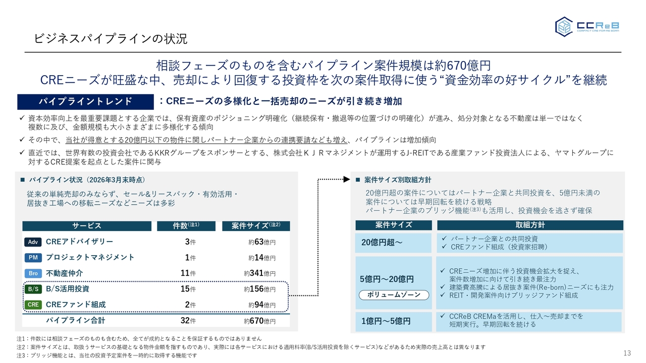 案件サイズごとの取り組み方針をスライド右側に記載していますが、20億円を超える物件についても、パートナーと組みながら取り組むことで、企業の旺盛な売却ニーズや有効活用ニーズに対して応えていきたいと考えています。