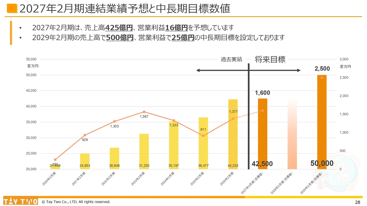 補足として、本年の売上高425億円は、今回の決算開示の対象年度とほぼ近い値になっています。2026年2月期は、特定のメーカーにおけるゲームの新品ハードウェアの発売があり、こちらがお客さまの支持を大きく集めたタイトルとなりました。