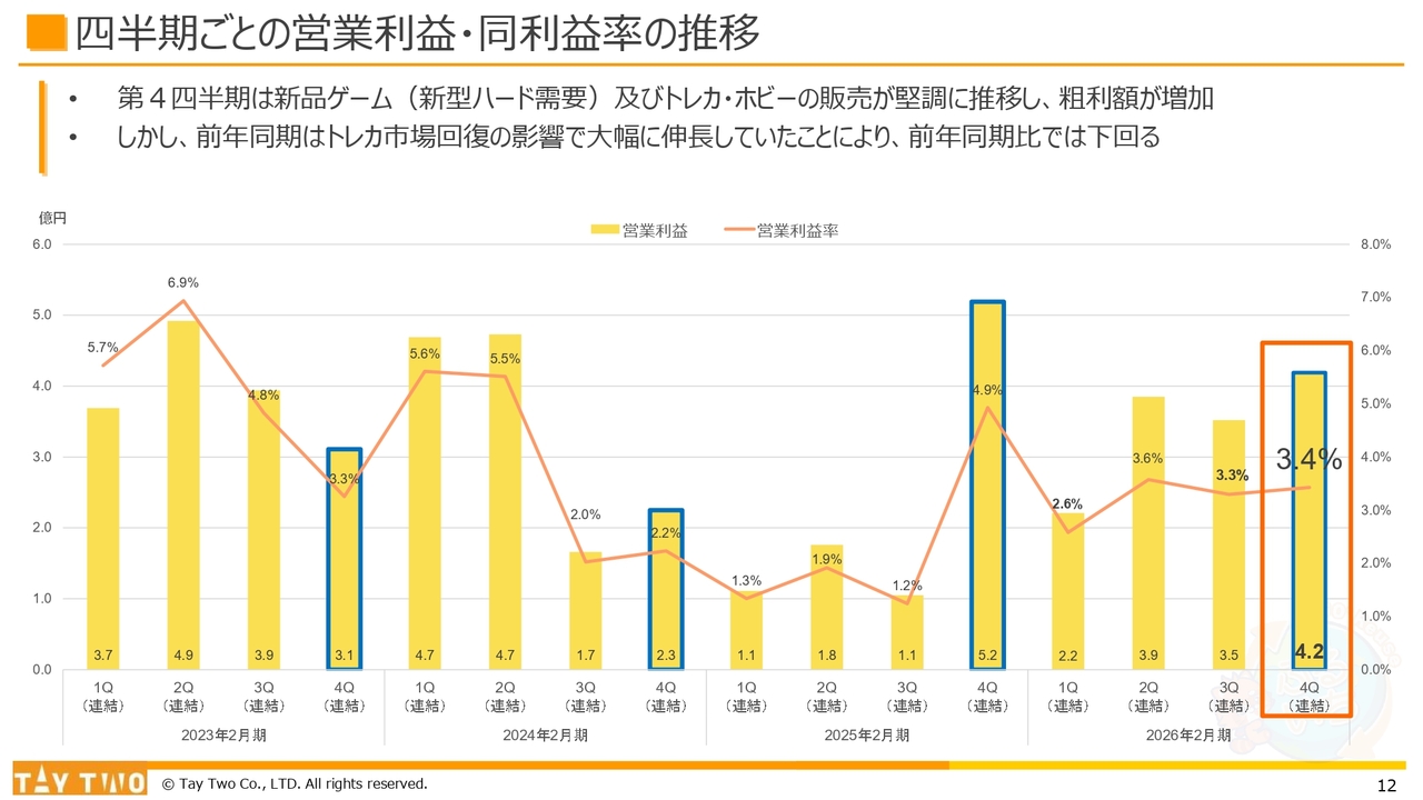 営業利益および利益率の推移です。第4四半期は、新品ゲームやトレカ・ホビーの販売が堅調に推移し、粗利額が増加しました。