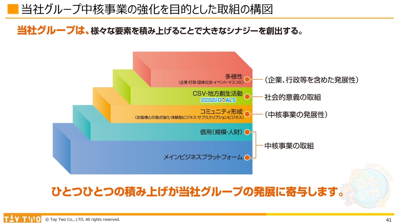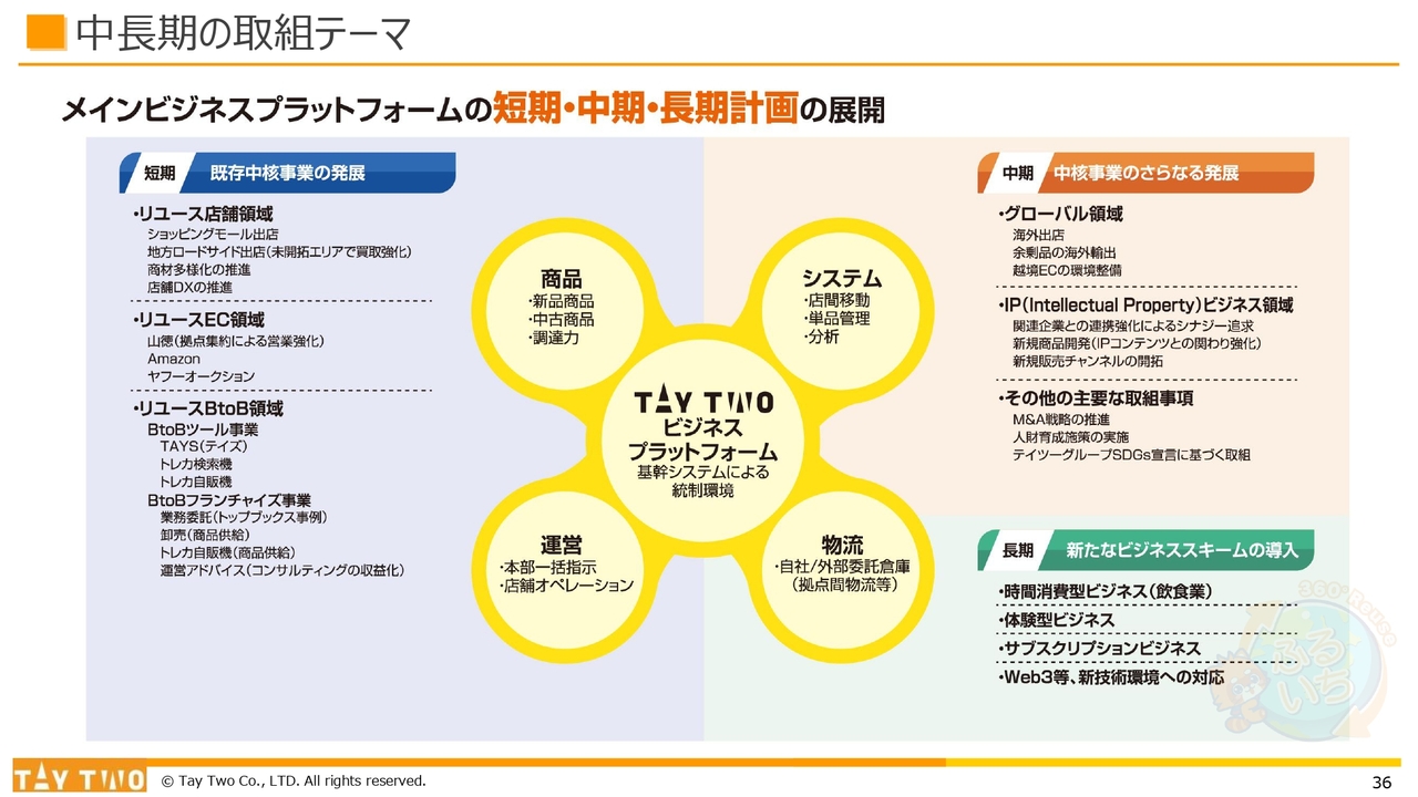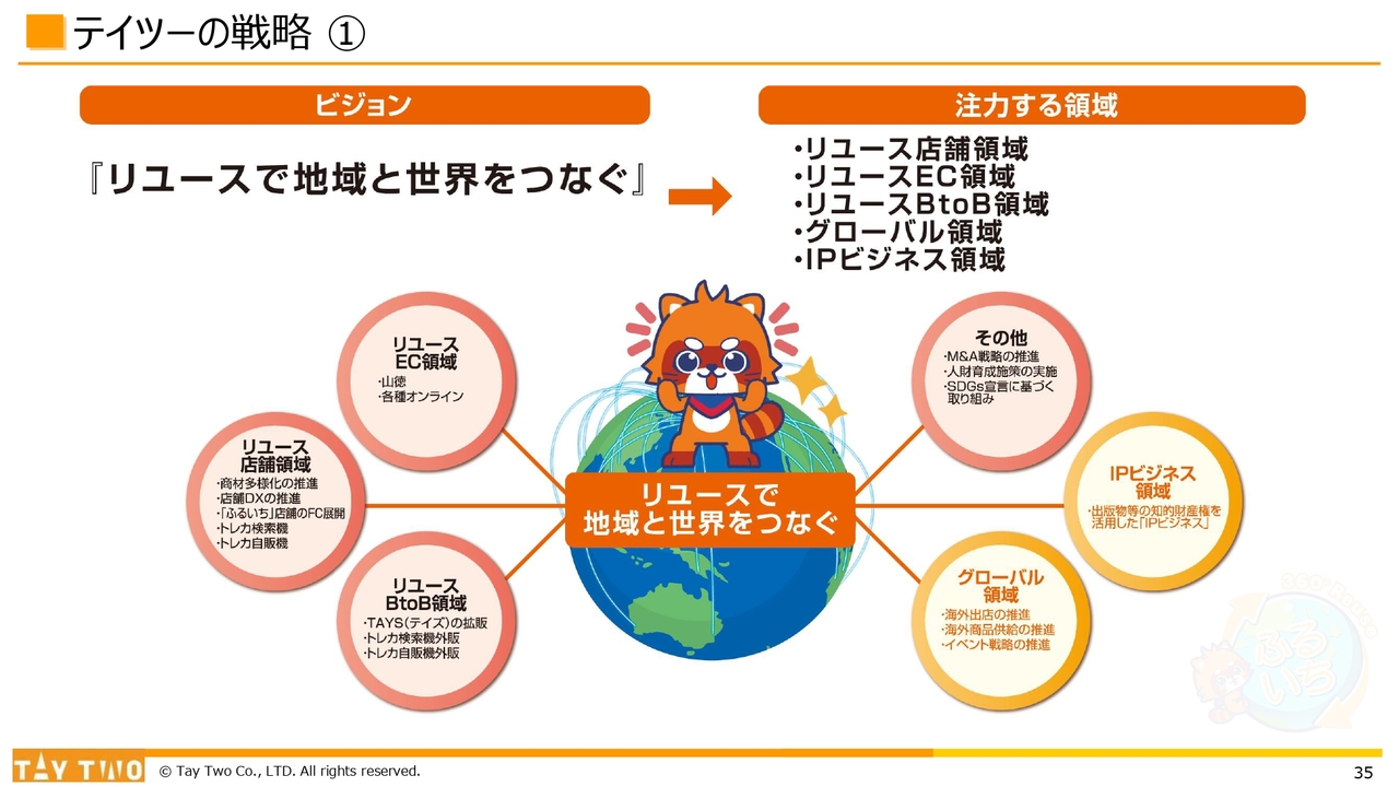 今回の決算発表の該当項目としても分類していますが、リユース店舗領域、リユースEC領域、リユースBtoB領域、グローバル領域、IPビジネス領域という注力領域を構成しており、これらを基に事業の中核部分を発展させていきたいと考えています。