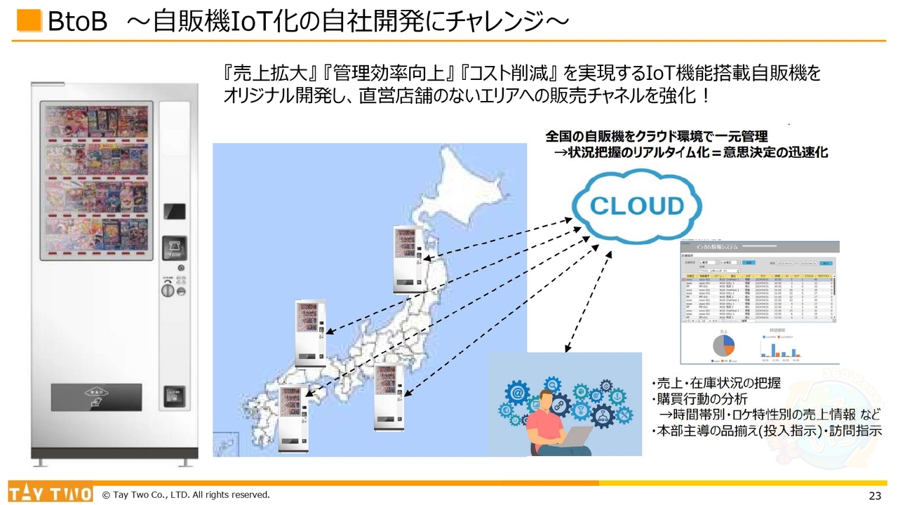 従来型はトレーディングカードを中心とした商材構成となっていましたが、今回、IoTによる情報の共有化を本部のサーバーと連携させた状態で、他の商材も取り扱える筐体に変更するとともに、当社の経営が成り立つような安価な機器の開発を推進していきたいと考えています。当期中に、これらの開発と実装を整えていく予定です。