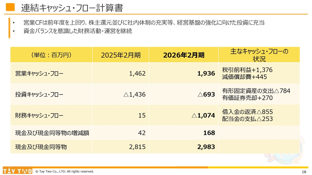 スライドは連結キャッシュ・フロー計算書です。営業キャッシュ・フローは前年度を上回り、株主還元や社内体制の充実など、経営基盤の強化に向けた投資に充当しています。資金のバランスを意識した財務活動と運営を継続しています。