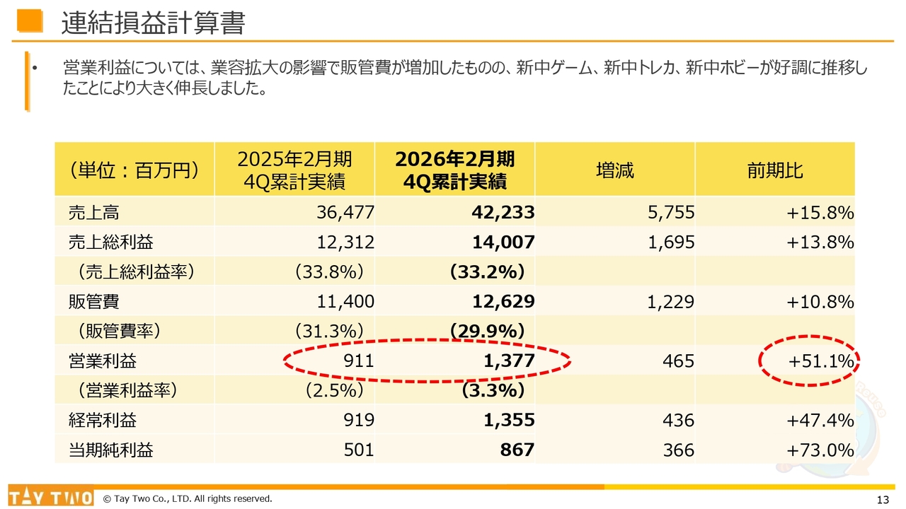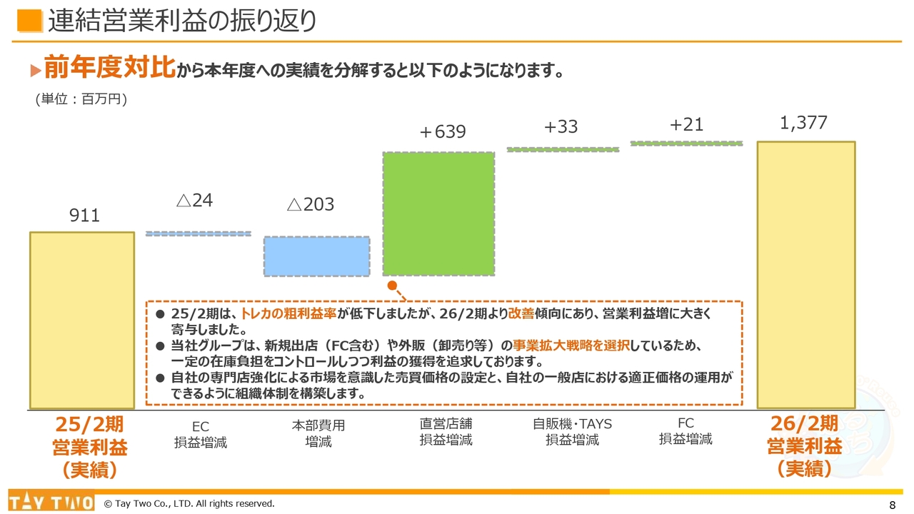 連結営業利益についての振り返りです。前期はトレカの粗利率が低下していましたが、2026年2月期より改善傾向に入り、営業利益の増加に大きく寄与しています。