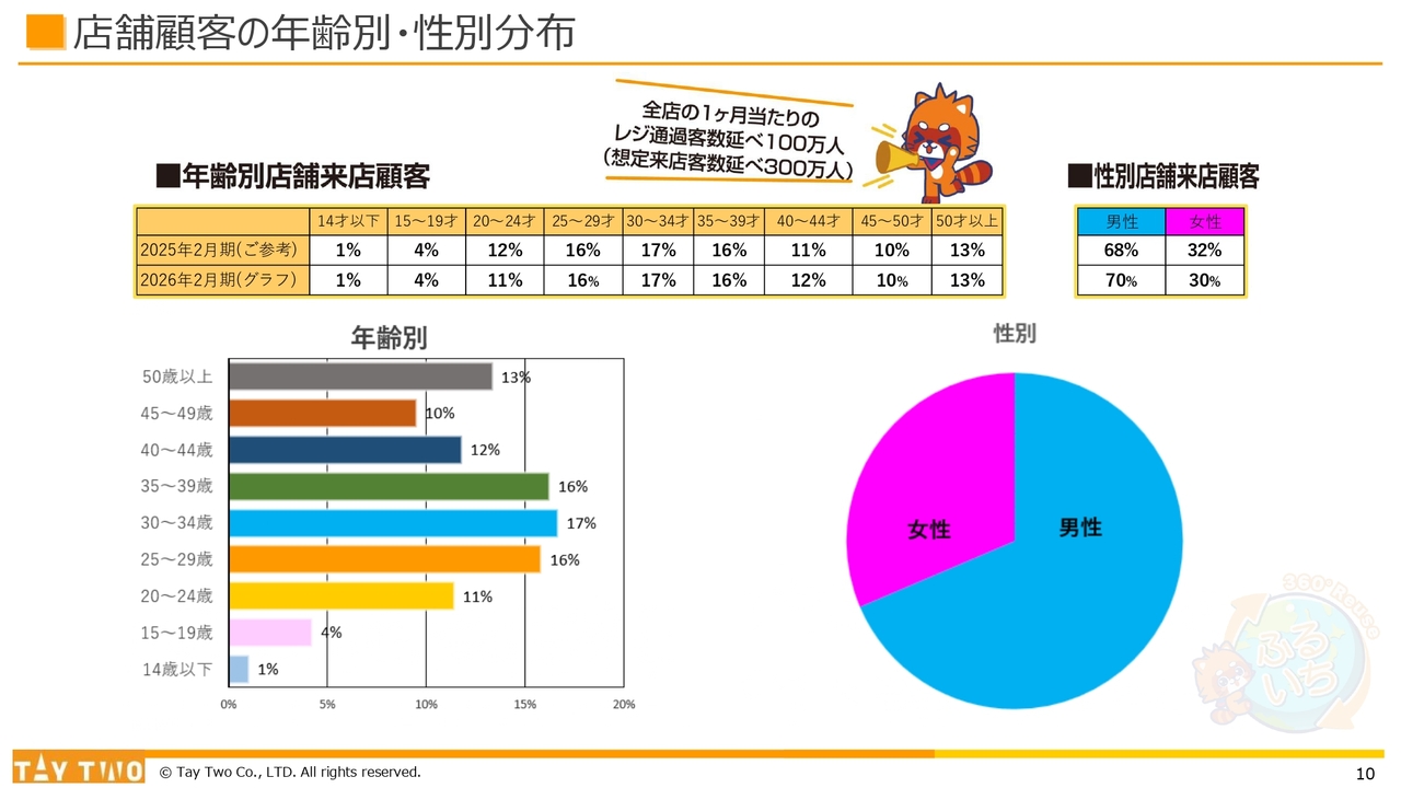 店舗顧客の年齢別・性別の分布です。男性顧客が多めである理由として、会員登録されている方の中に家庭の父親がやや多いことが影響しているのではないかと考えています。また、全店の1ヶ月当たりのレジ通過客数は、延べ100万人の水準を維持しています。