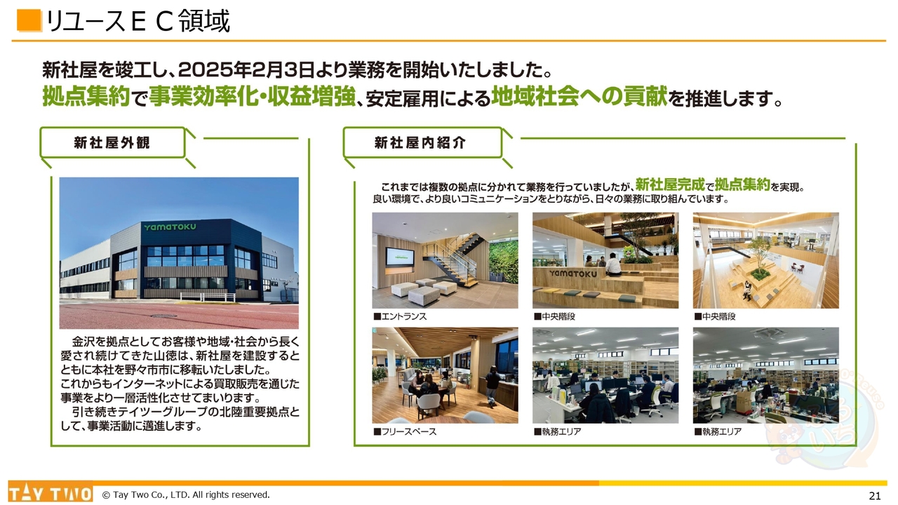 リユースのEC領域です。2025年2月3日に新社屋を竣工した子会社の山徳社は、もともとの7拠点を集約することで、事業の効率化、収益の増強、安定雇用による地域社会への貢献を推進していきます。