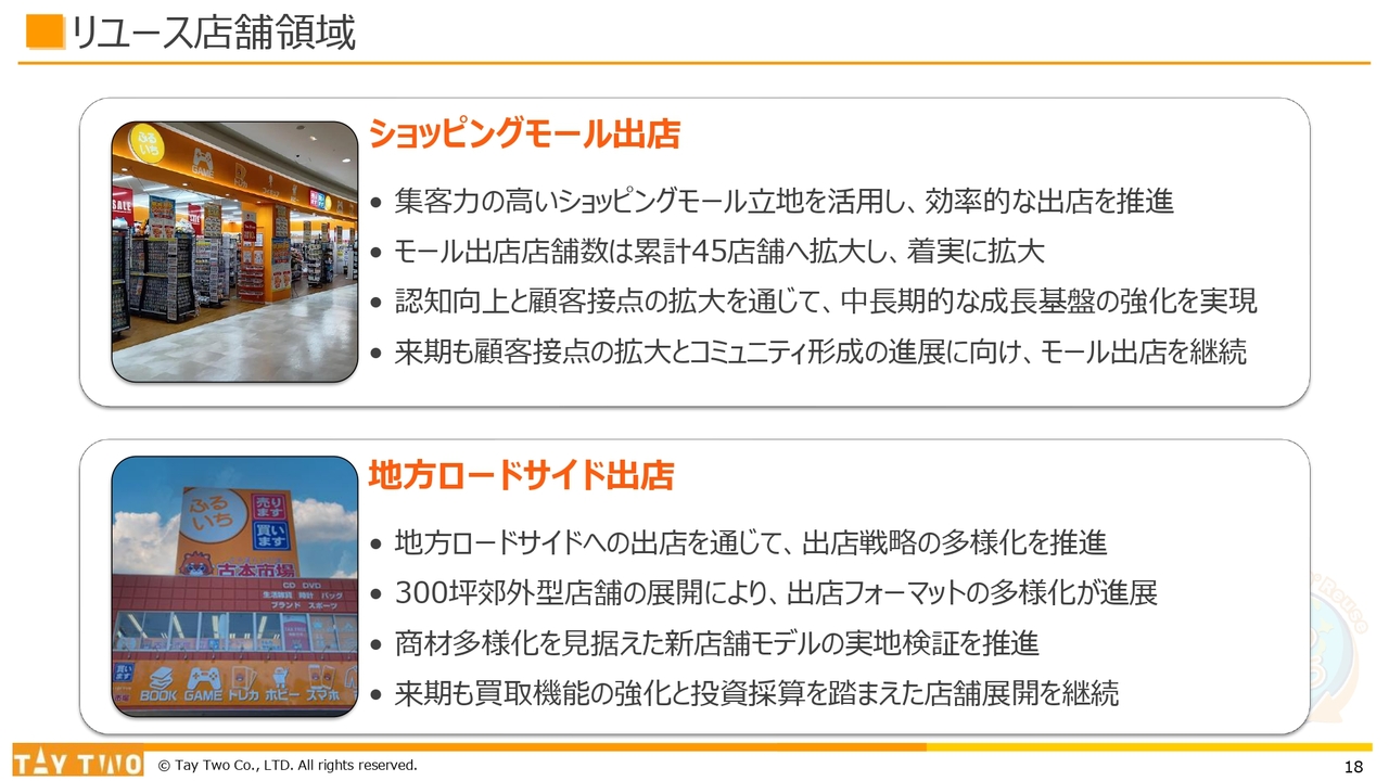 リユースの店舗領域では、ショッピングモールへの出店が進んでいます。モール出店の店舗数は累計45店舗へ拡大しており、着実に伸びています。