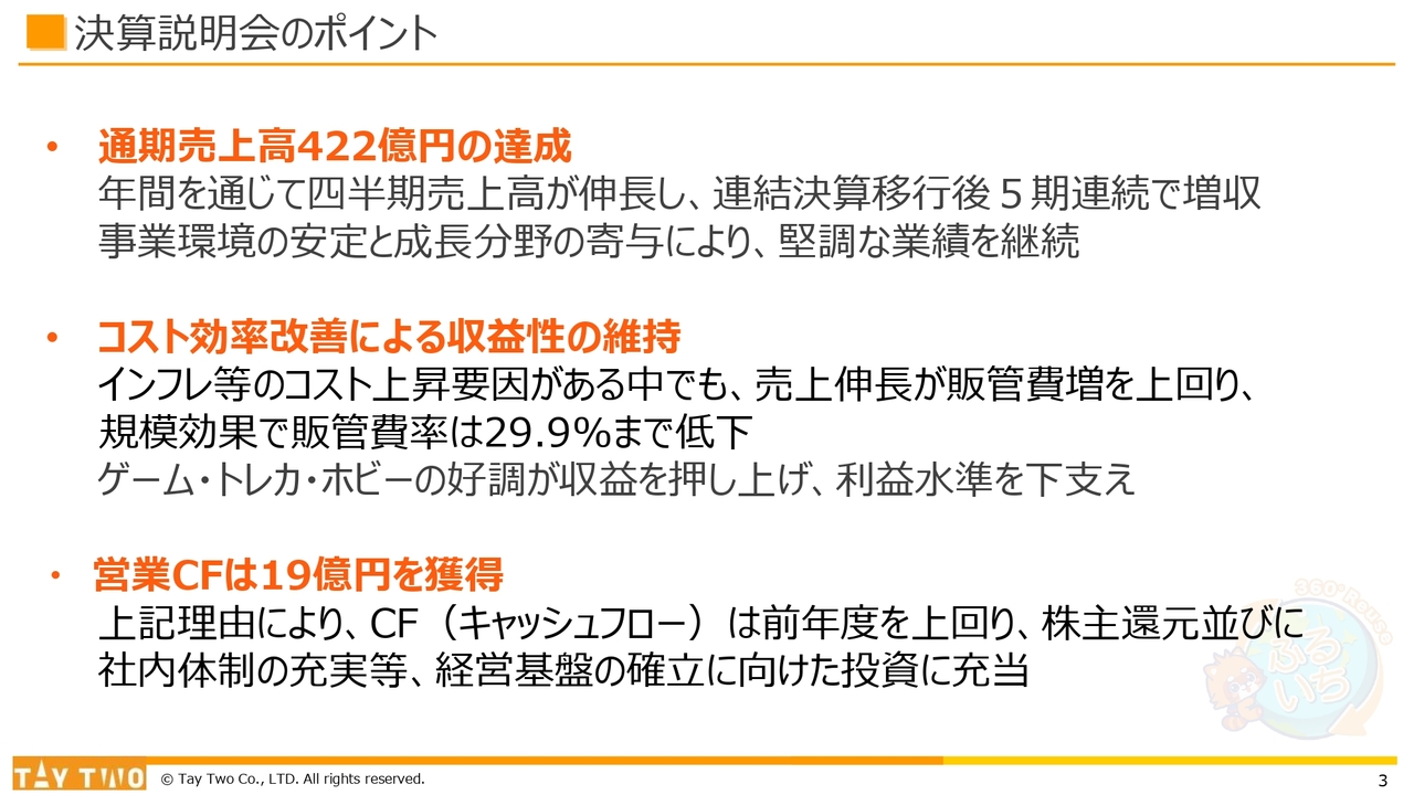 決算説明会のポイントは3点です。通期売上高422億円を達成しました。コスト効率の改善により、収益性を維持しました。また、営業キャッシュ・フローは19億円となりました。