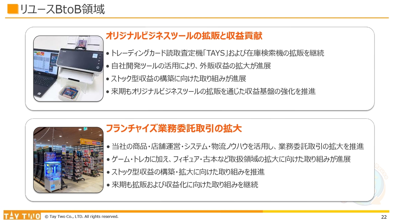 リユースのBtoB領域です。オリジナルビジネスツールの拡販と収益の貢献については、トレーディングカードの読み取り査定機「TAYS」の拡販が引き続き順調に推移しています。当期は大手との契約も獲得しており、引き続き収益拡大に努めていきます。