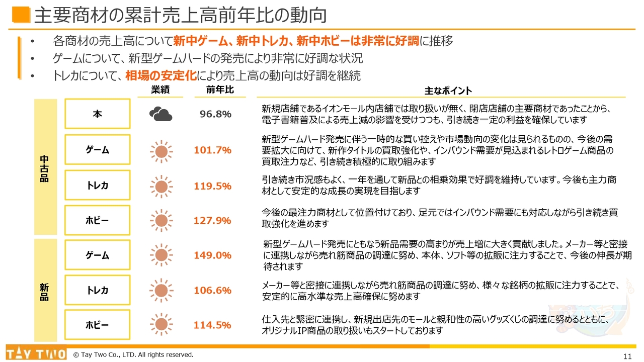 ゲームは、新型ゲームハードの販売が寄与し、非常によい状況です。トレカは、相場の安定化によって売上高の好調を継続しています。