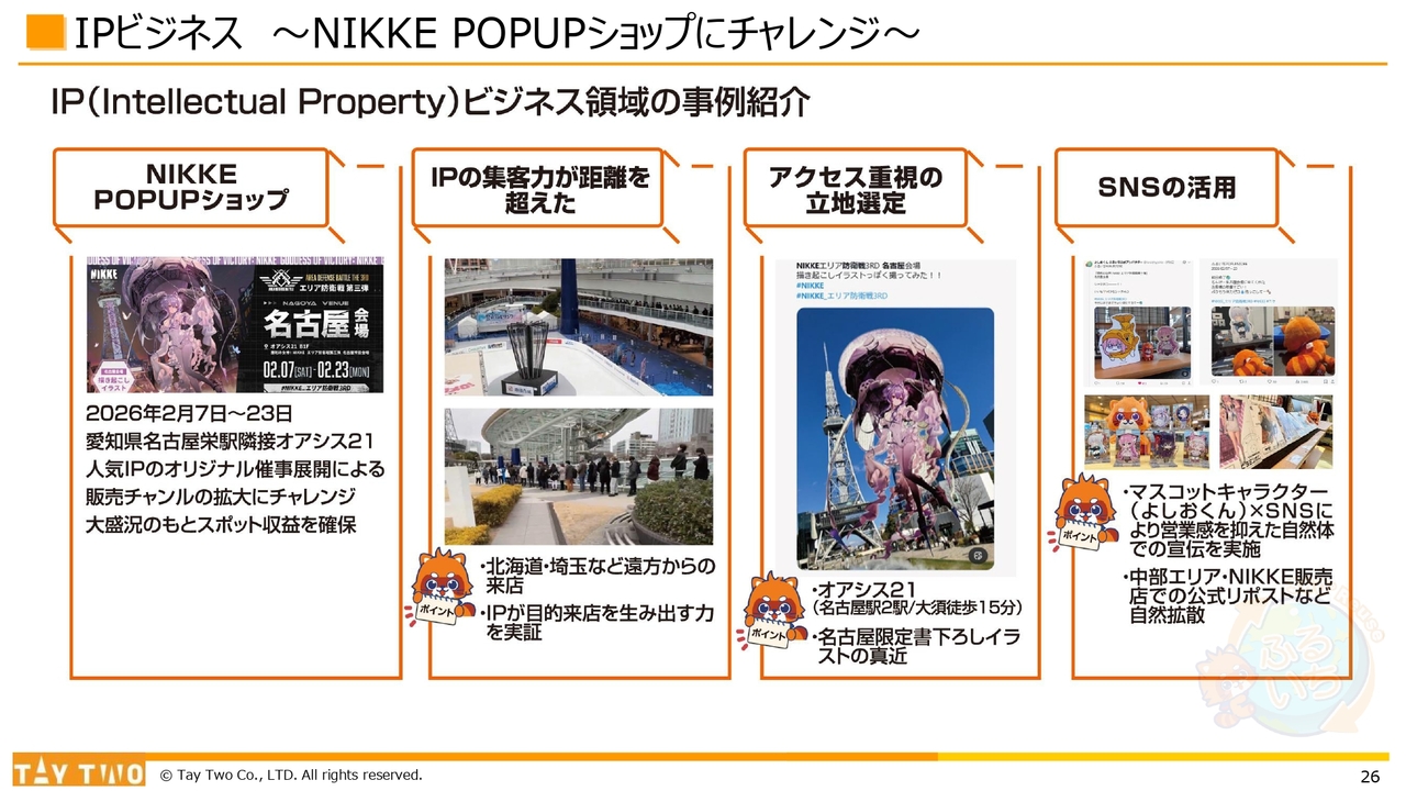 IPビジネスについては、2026年2月に約2週間、連携企業の協力のもと、名古屋においてIPタイトルとして企画を展開しました。非常に活況を呈し、実績を確保しています。