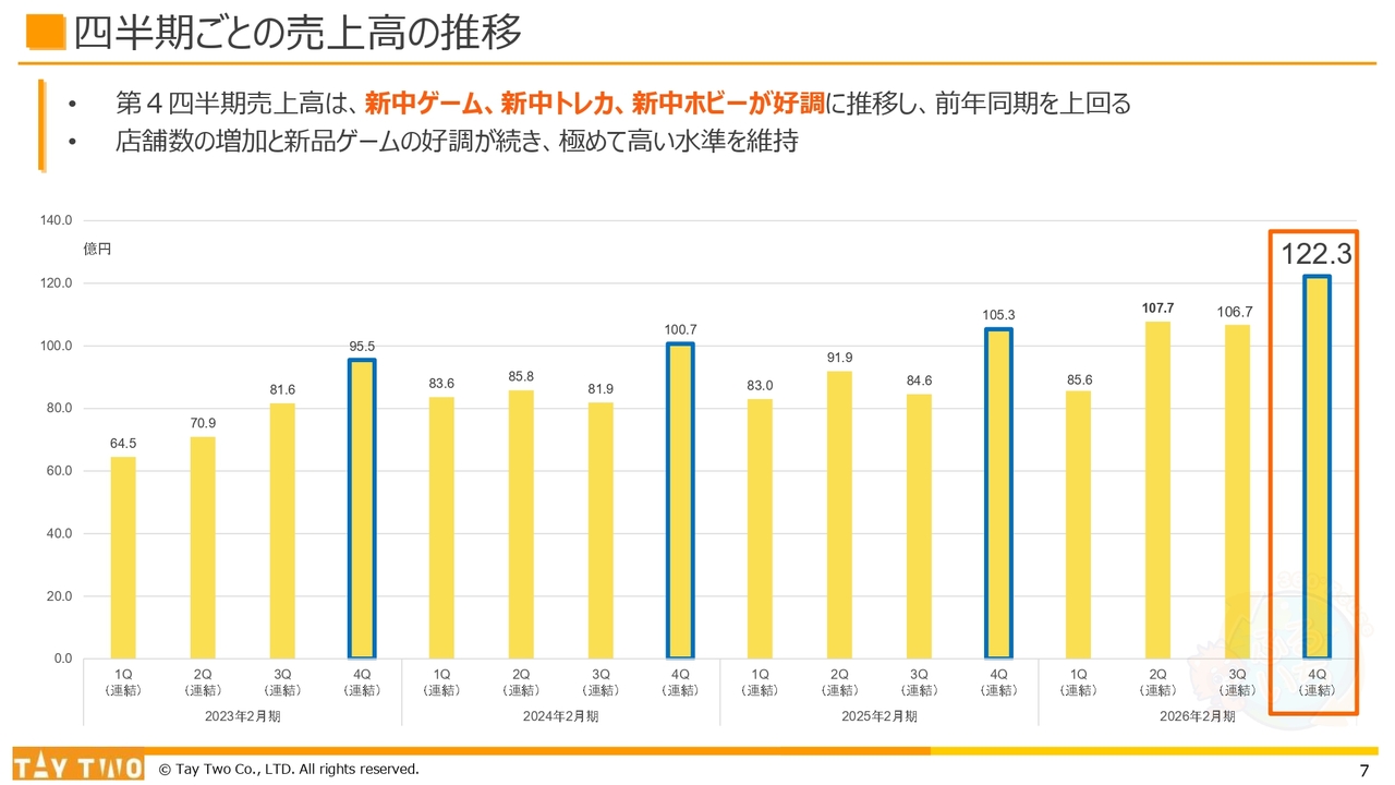 四半期ごとの売上高の推移です。第4四半期の売上高は、「新品・中古(以下、新中)ゲーム」「新中トレカ」「新中ホビー」が好調に推移し、前年同期を上回りました。