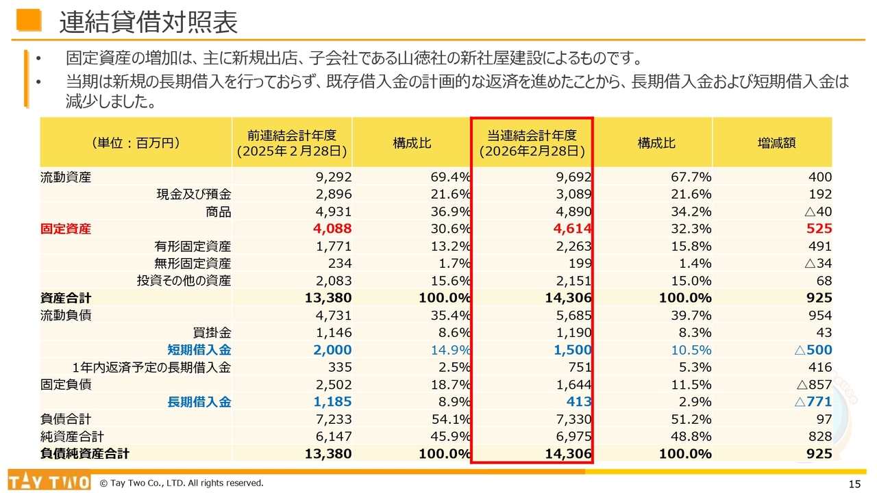 連結貸借対照表です。固定資産の増加は、主に新規出店、および子会社である山徳社の新社屋建設によるものです。