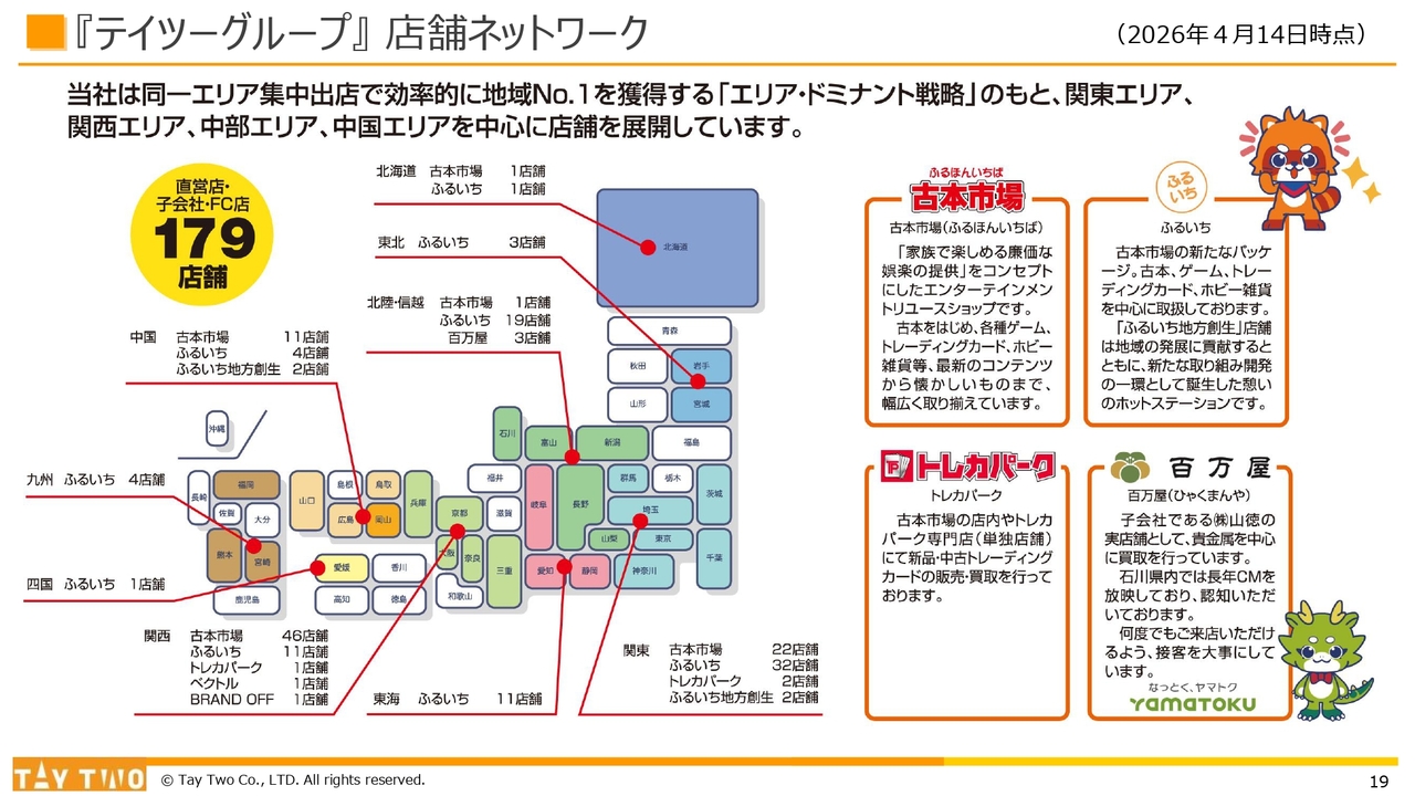 テイツーグループの店舗ネットワークです。今回から、山徳社の営業店舗を追加で記載しています。本日4月14日時点で、直営店、子会社、FC店を含めた合計は179店舗の体制です。