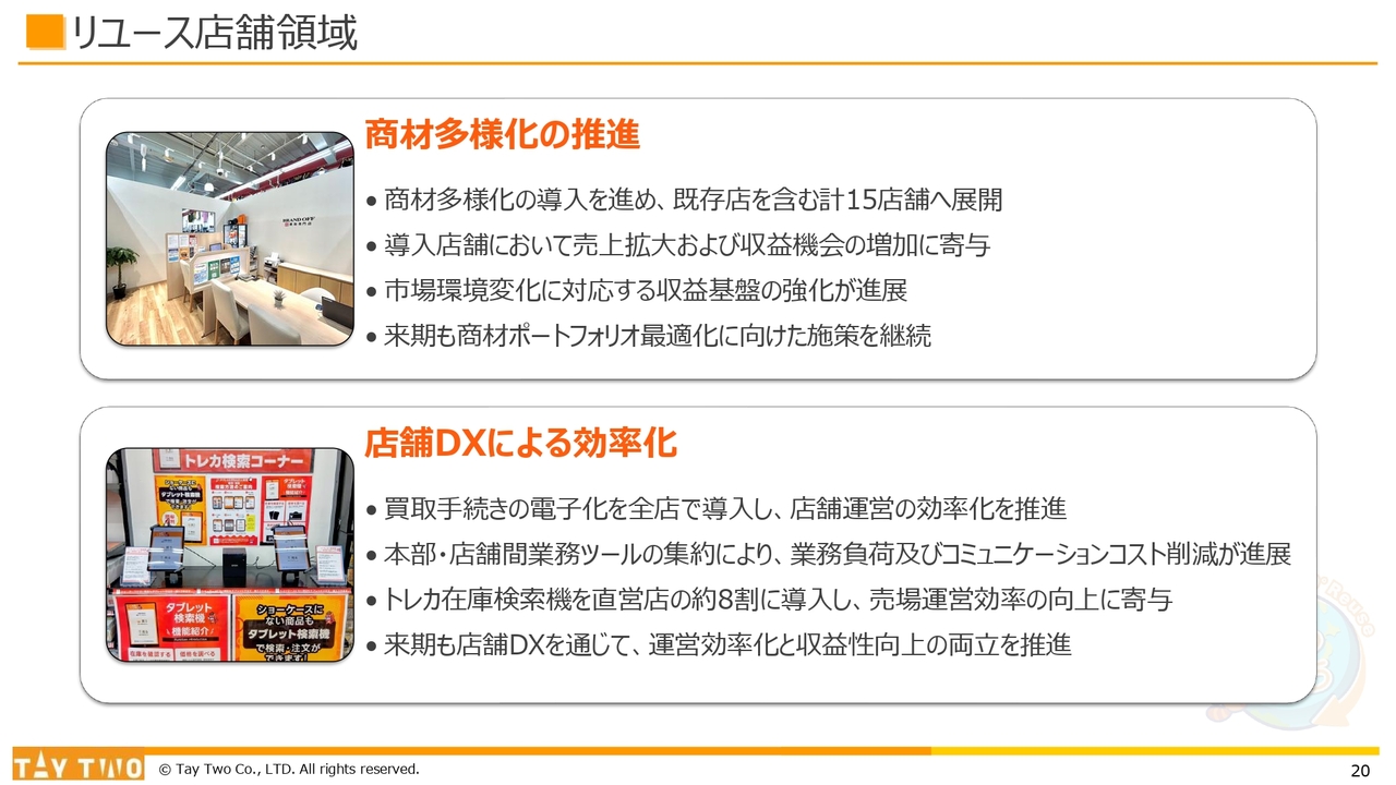 店舗DXによる効率化に関しては、原材料費高騰の中でさまざまな工夫を施しています。トレカの在庫検索機を直営店の8割に導入しており、売り場効率の向上に寄与していることが確認できています。今後はBtoB商材への切り替えを検討していきたいと考えています。