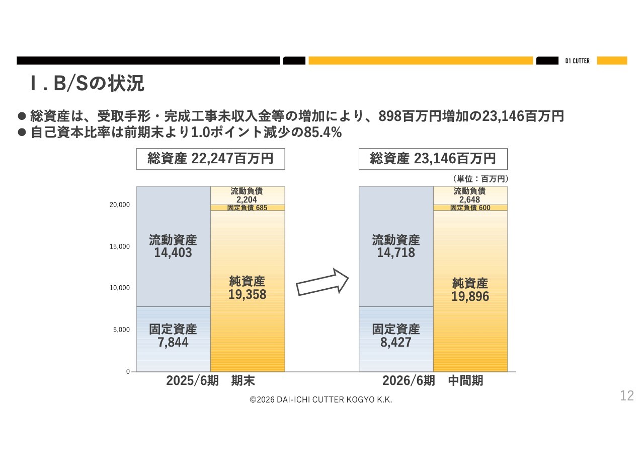 バランスシートは、受取手形および完成工事未収入金などの増加により、総資産が増加しています。ただし、全体の構成に大きな変化は生じていません。