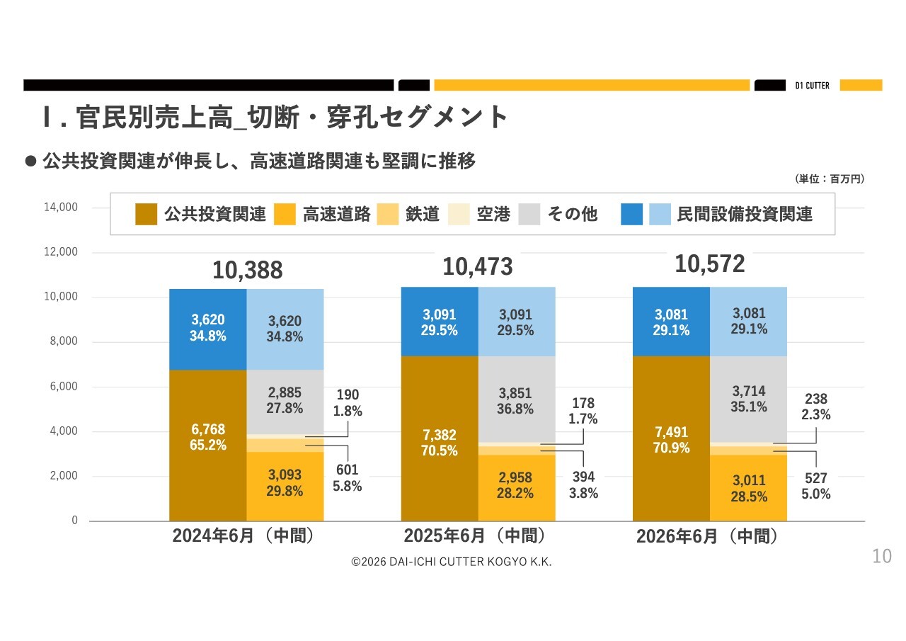 スライドには、切断・穿孔工事事業の直近3期の中間期における売上を官民別に分解しています。ここでの「公共投資関連」は、「高速道路」「鉄道」「空港」「その他」といった公共案件を含む合計であり、「民間設備投資関連」は別枠で示しています。