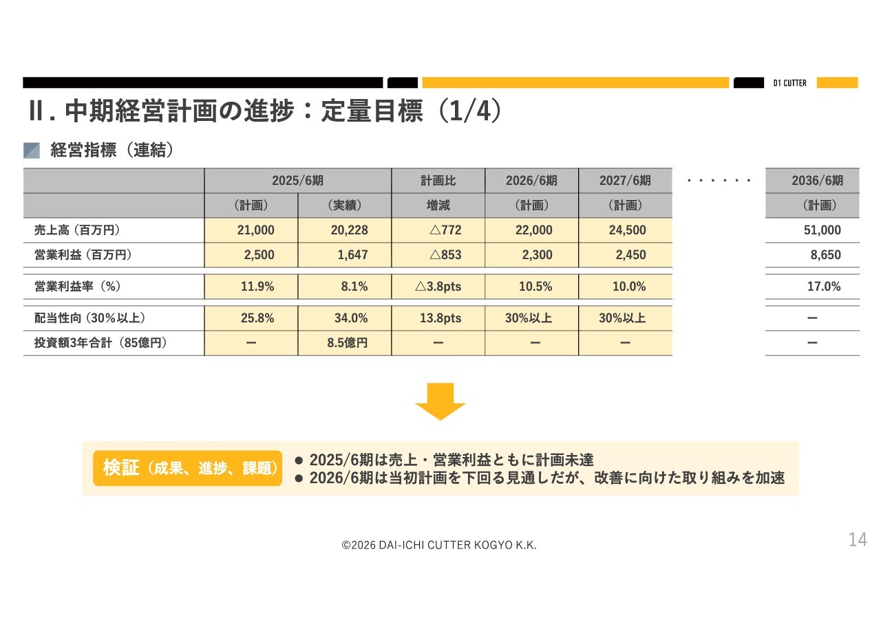 まず、中期経営計画の進捗です。スライドに記載の2026年6月期の計画値は、中期経営計画策定時点での数値です。足元の通期業績予想、特に今回修正後の見通しについては、後ほど別スライドであらためてご説明します。