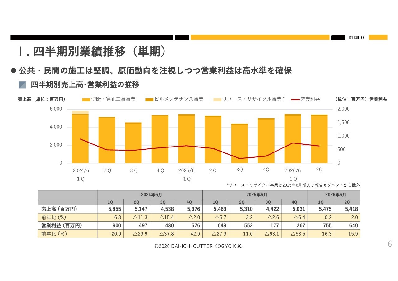 背景として、高速道路リニューアル関連の減少影響や原価・経費の増加が挙げられ、利益率面でも課題が残りました。一方で、公共・民間ともに需要自体は底堅く、当社は引き続き採算改善と施工体制の強化を中心に立て直しを進めています。