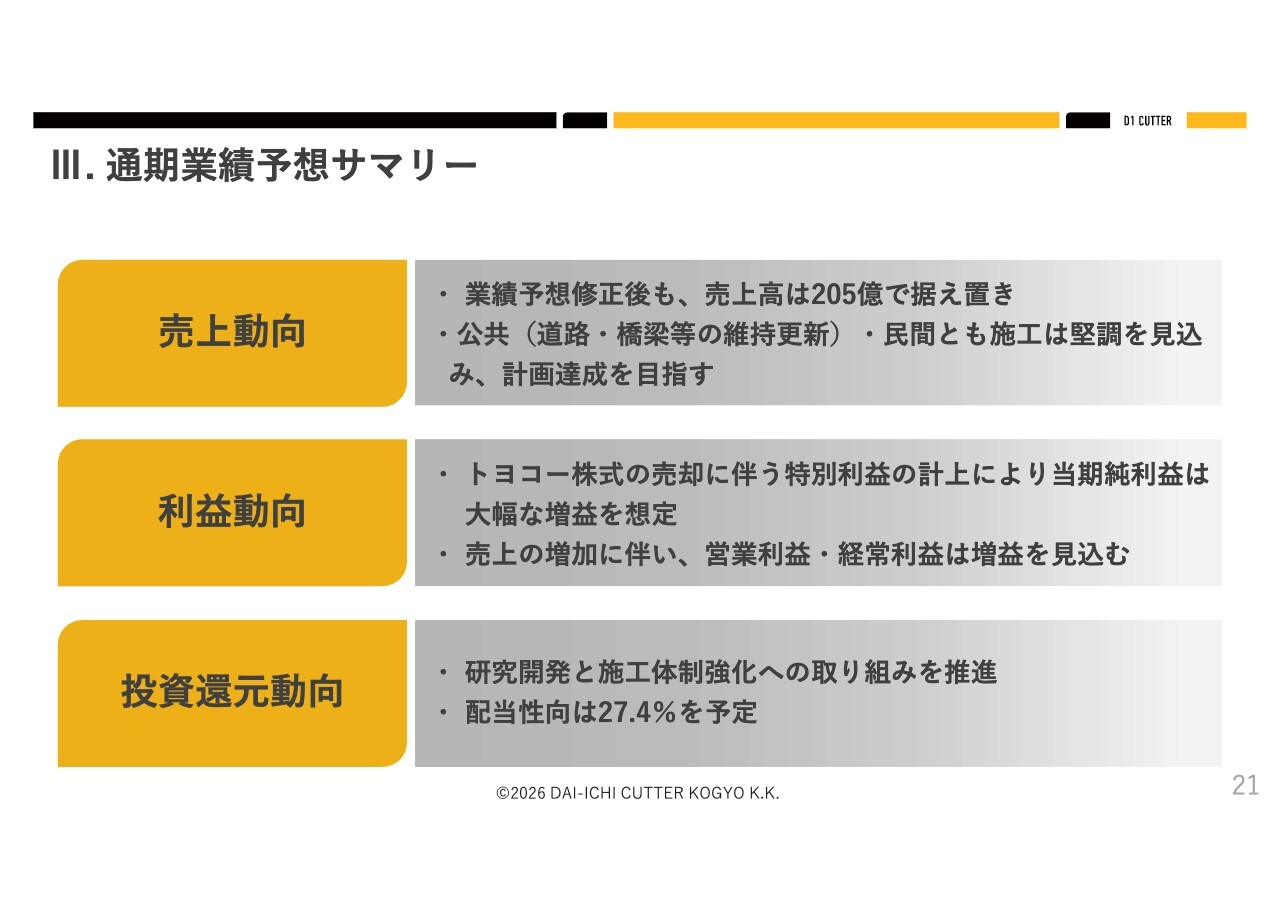 こちらを踏まえて業績予想を修正しましたが、事業の前提となる受注環境や売上計画には大きな変更はなく、修正内容は主に最終利益への影響を反映したものとなっています。