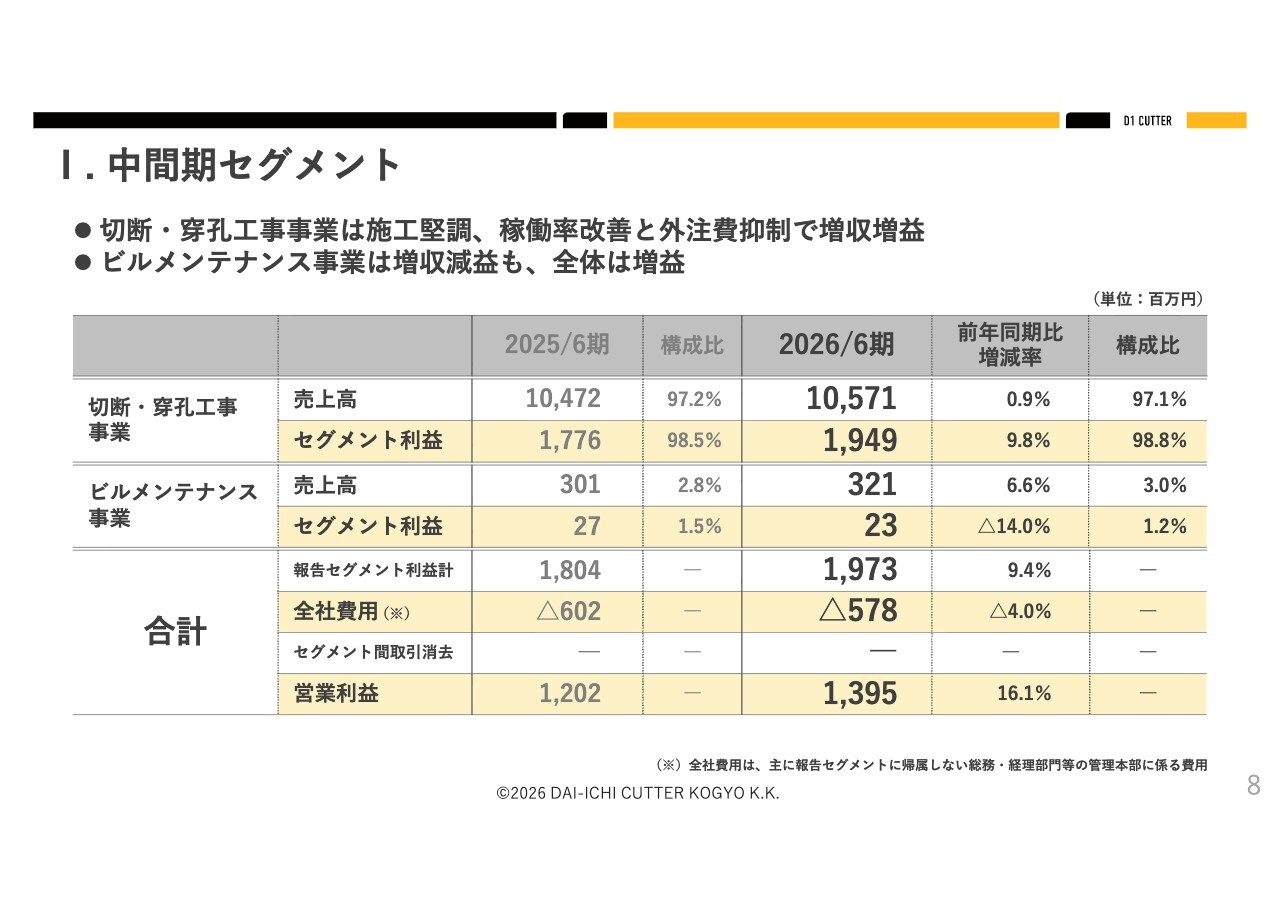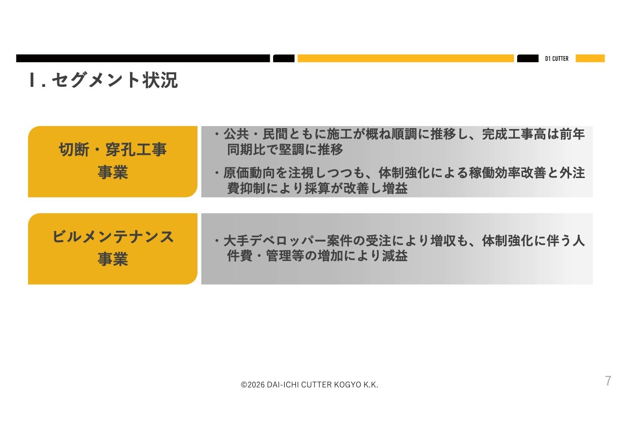 セグメント別の状況です。スライド上段が切断・穿孔工事事業、下段がビルメンテナンス事業です。