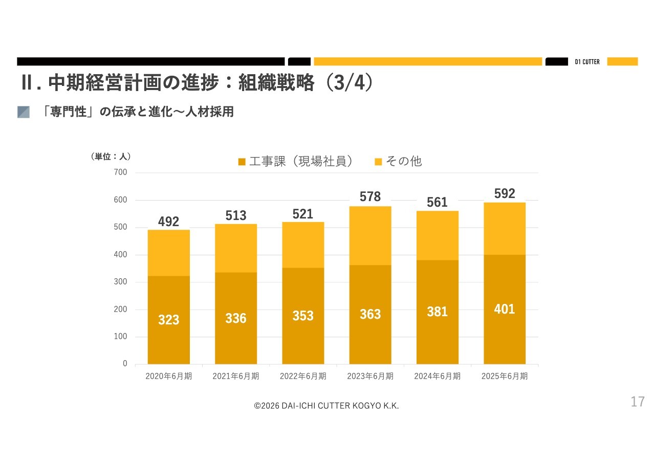 スライドのグラフにあるように、工事課、いわゆる現場社員は2020年6月期の323名から2025年6月期には401名まで増加しています。全社では592名となり、人員基盤が着実に厚くなっています。