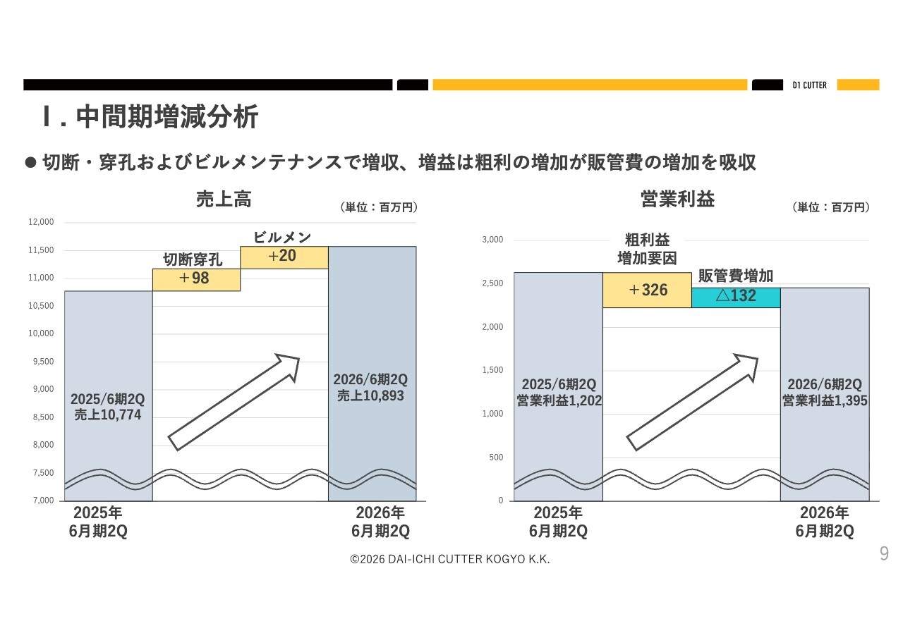 スライドの冒頭に記載のとおり、売上は切断・穿孔工事事業およびビルメンテナンス事業で増収となり、利益面では売上総利益の増加が販管費の増加を吸収したかたちです。