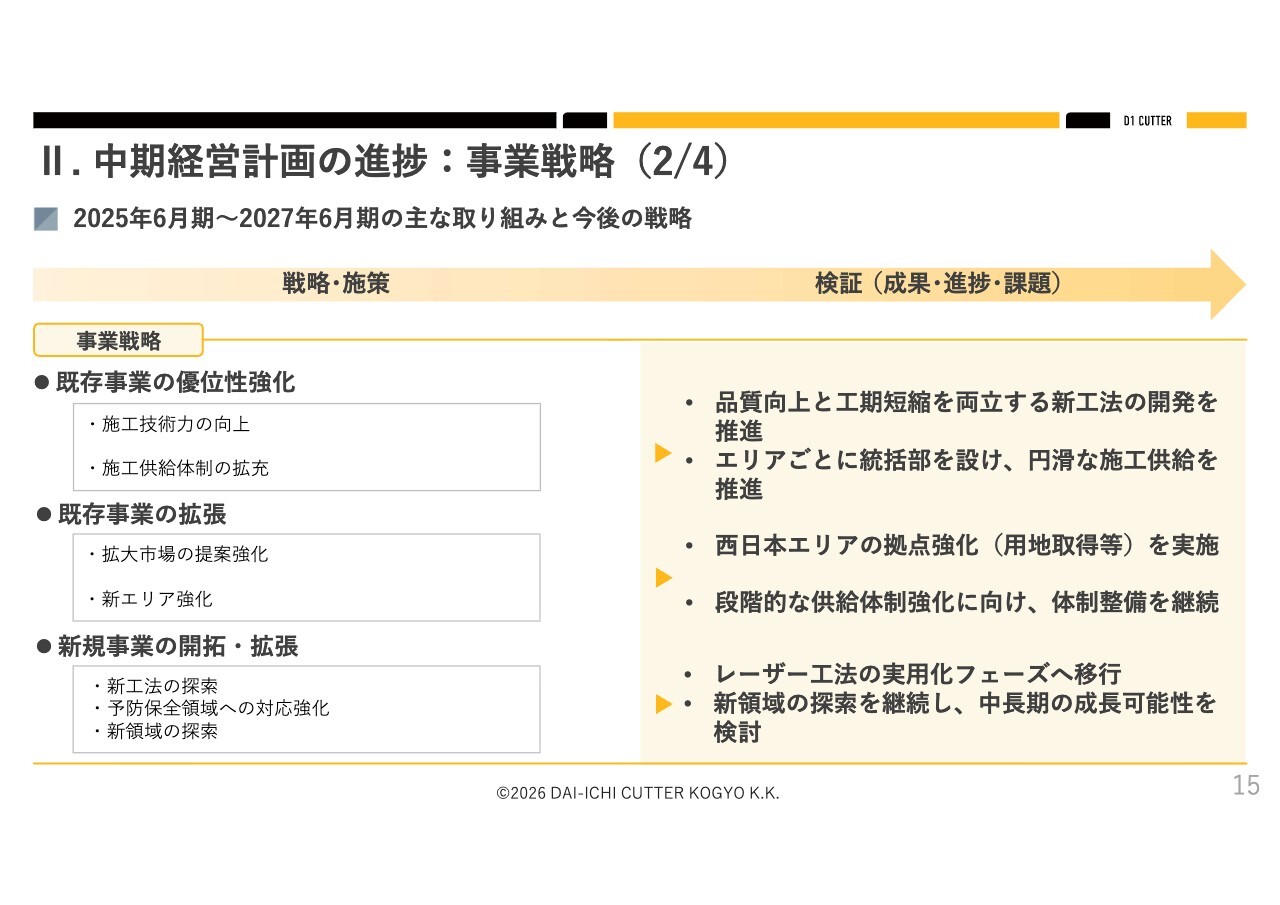 また、「新規事業の開拓・拡張」に関連し、レーザー工法については、前回ご説明した実用化フェーズの位置づけのもと、足元では実際の現場での施工を通じて検証と運用整備を継続しています。