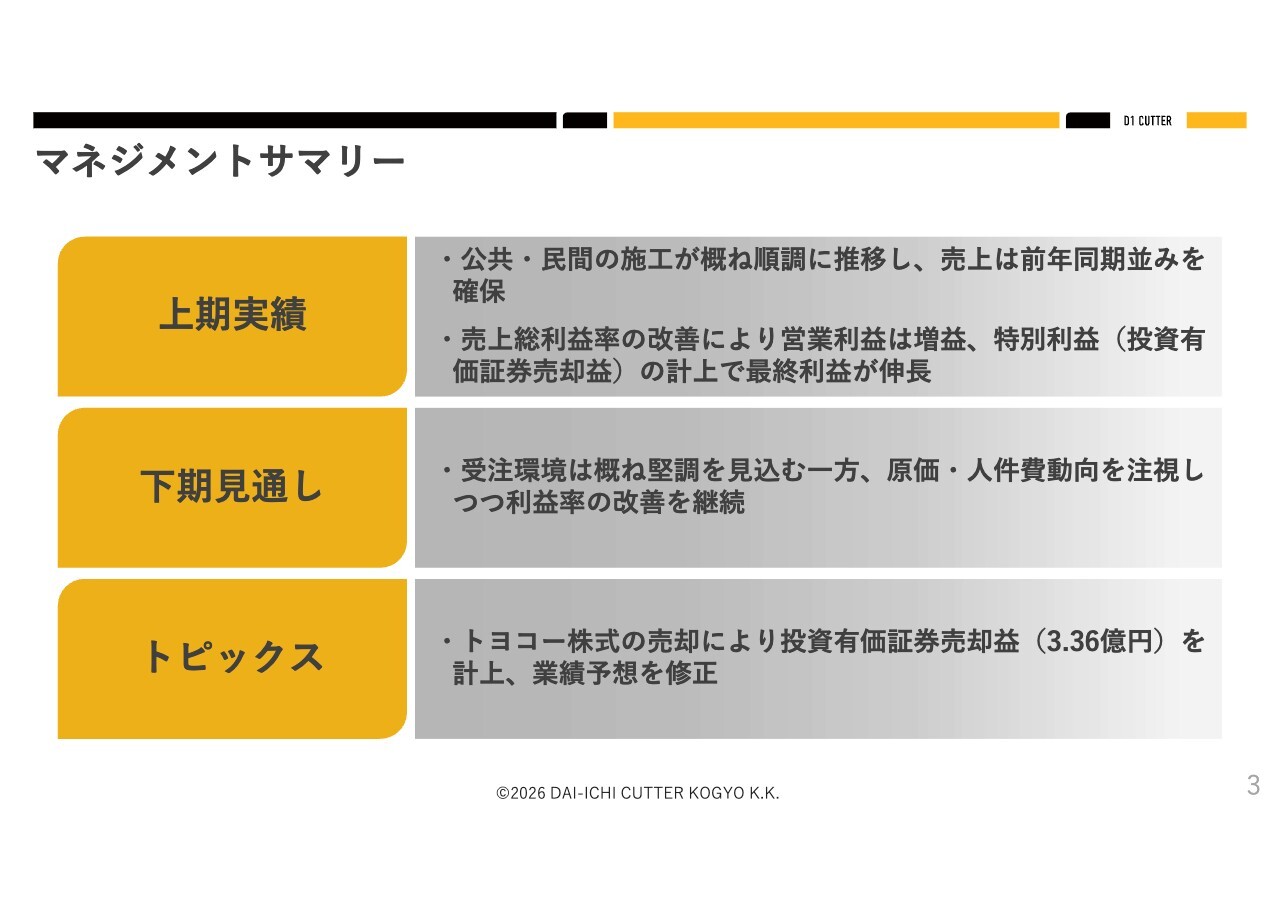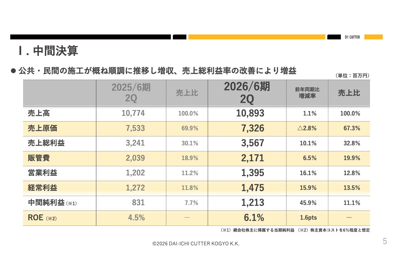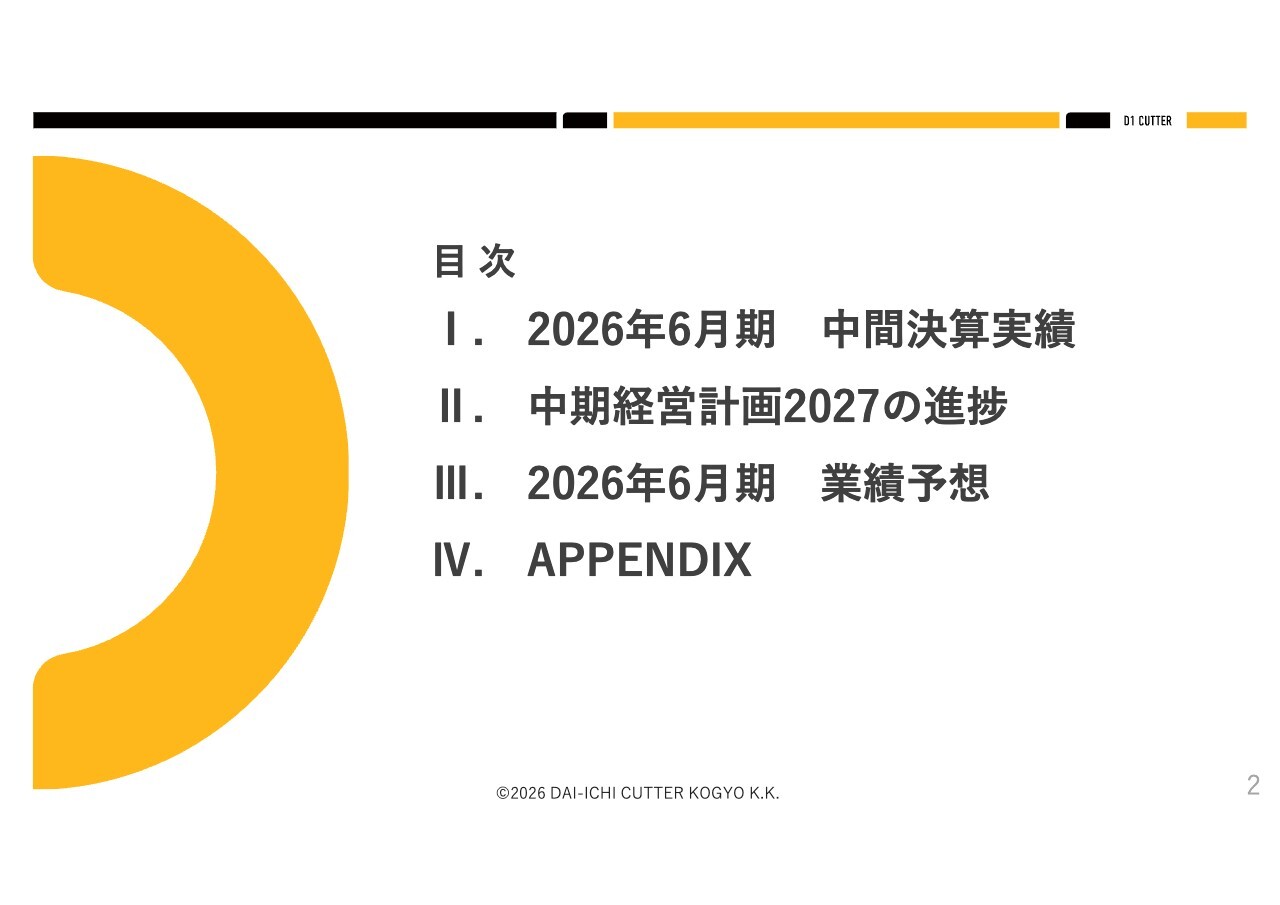 安達昌史氏(以下、安達):みなさま、こんにちは。第一カッター興業株式会社代表取締役社長の安達です。本日はお忙しい中、当社決算説明会へご参加くださり、誠にありがとうございます。それでは、2026年6月期中間決算についてご説明します。