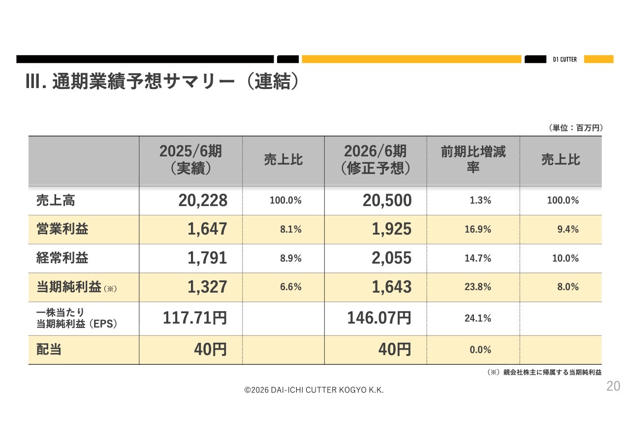 加えて、上期の実績でも確認できたように、外注加工費などのコスト抑制や採算改善が進んでおり、営業利益・経常利益も増益を見込むかたちで見直しています。つまり、当期純利益は特別利益の影響が大きい一方で、営業利益・経常利益の段階でも改善が進んでいます。