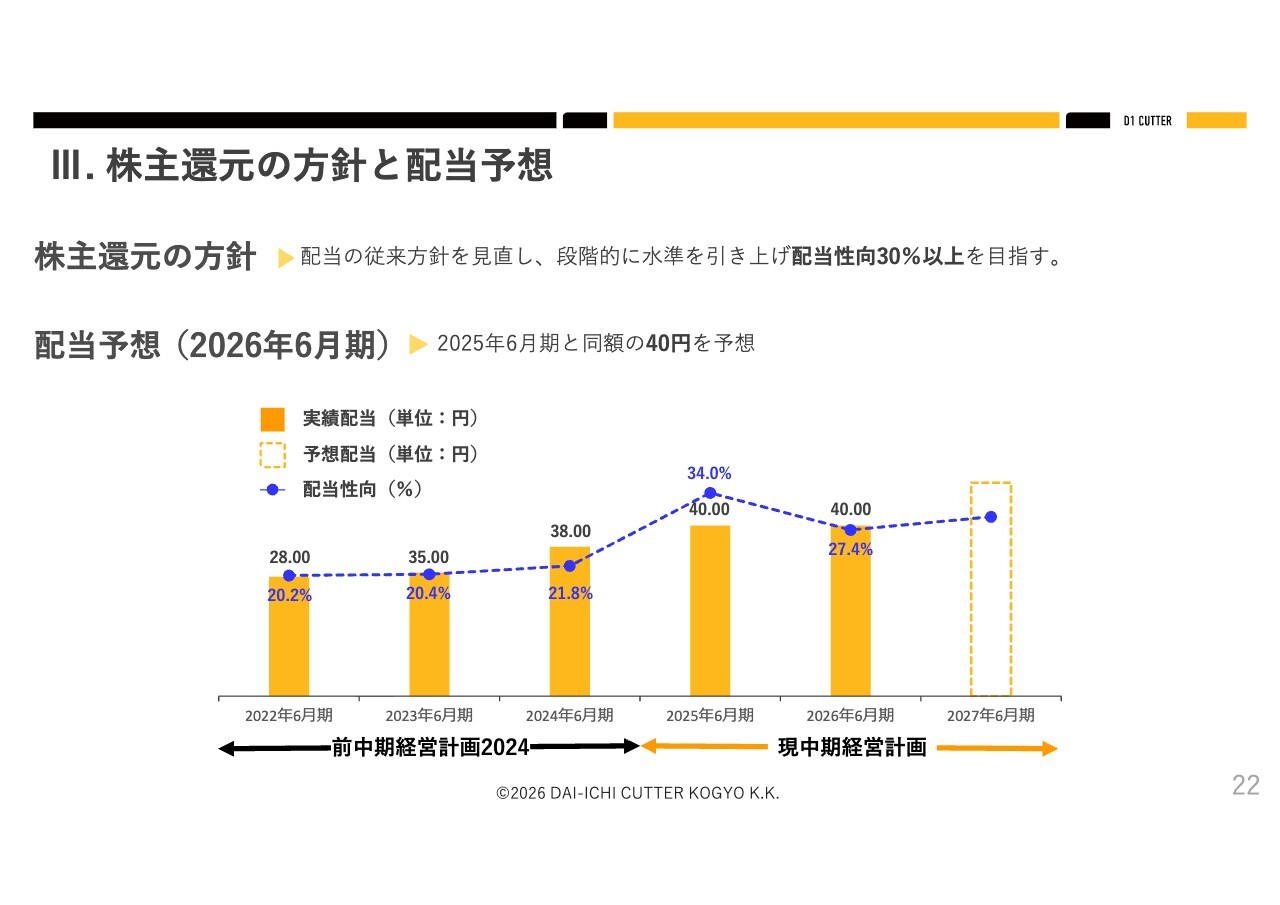 2026年6月期の配当予想は、現状では前期と同額の1株当たり40円を予定しています。足元では、事業の採算改善と利益水準の底上げに取り組む一方で、安定的な配当を継続する視点から、まずは配当額を据え置く判断をしています。
