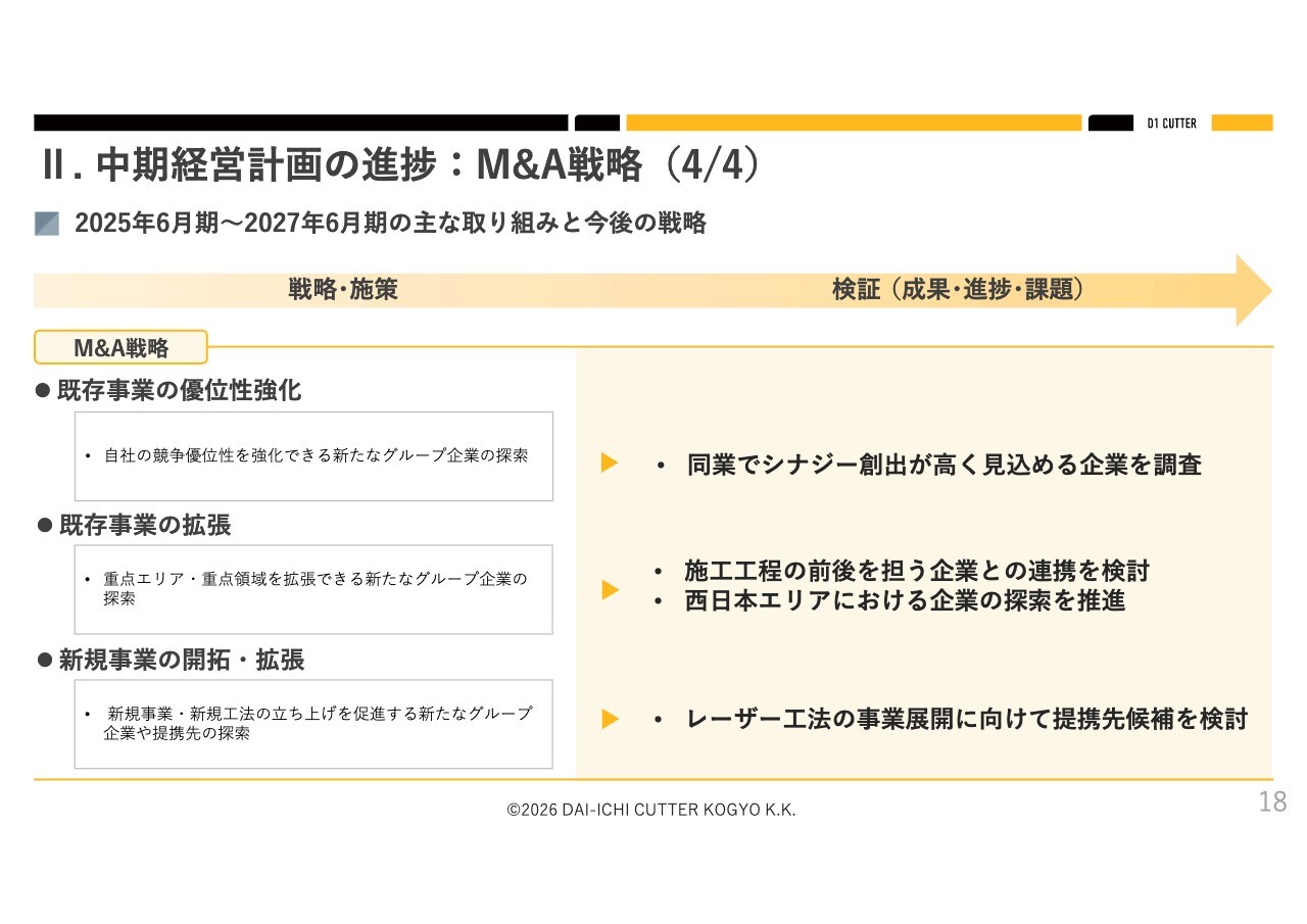 また、「既存事業の拡張」では、当社が担う施工工程の前後を補完できる企業との連携を検討し、実際に面談などのアプローチも行い、引き続き候補の検討を進めています。さらに、西日本エリアにおける候補企業の探索も継続しています。