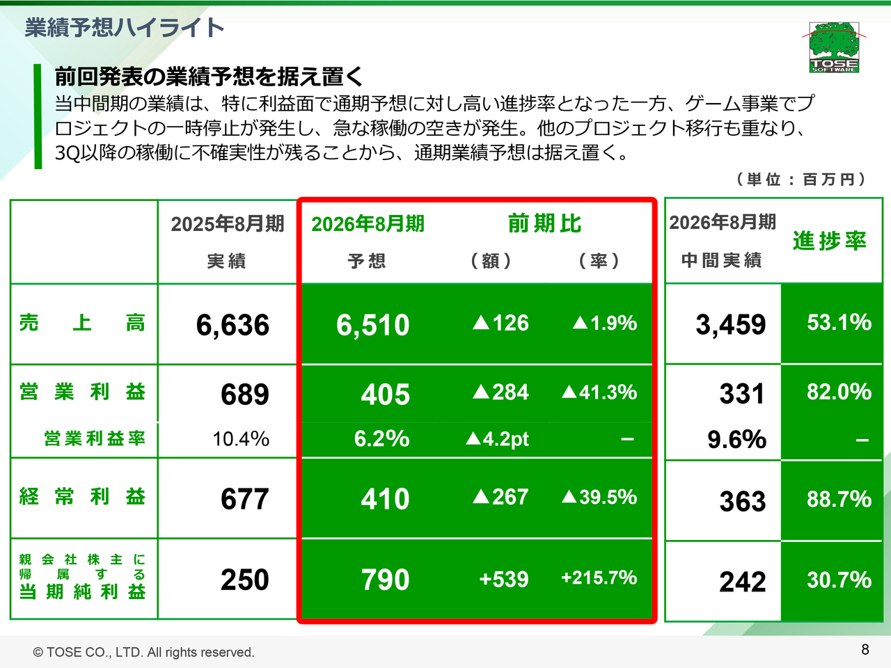 当中間期の業績は、売上・利益ともに堅調に推移しました。今後、主要な開発プロジェクトにおいてさらなる追加業務を受注する可能性もあります。一方で、スライド4ページにてご説明しましたとおり、海外ゲーム会社との開発プロジェクトが先方都合により一時停止し、第3四半期以降に予定していた工程が延期、再開時期未定であることから、急な稼働の空きが出ている状況です。また、期初からの想定どおり、主要なプロジェクトの一部が終盤工程に入っている状況とあわせ、第3四半期以降は複数のプロジェクトの立ち上げ、開発リソースの移行が重なる見通しです。現在、稼働を最大化すべく、新規プロジェクトの早期受注とスムーズな立ち上げに全力を注いでいます。こうしたプロジェクト移行期の不確実性を慎重に考慮し、現時点では業績予想を据え置くこととします。