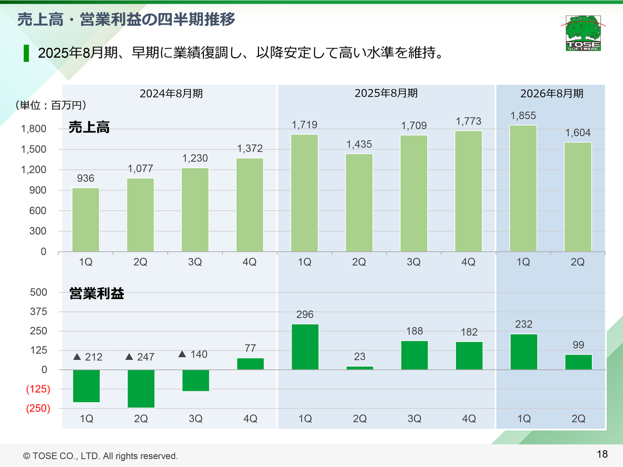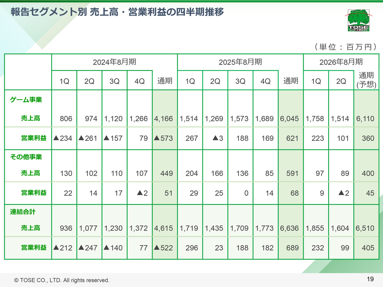 2024年8月期は次世代ゲーム機発表前の端境期であり、また加速する市場の変化により複数のゲーム関連会社において、開発中または開発したタイトルの評価替えがされるなど、ゲーム開発の⽅針や考え⽅の転換が⾒られました。当社においてもプロジェクトの中⽌や失注があったことに加え、新規クライアントとの開発プロジェクトでのトラブル等が重なり業績が⼀時的に低迷しましたが、地道に開発技術⼒の強化を進めてきたことで、2025年8⽉期に早期に復調し、売上・利益ともに安定して推移しています。