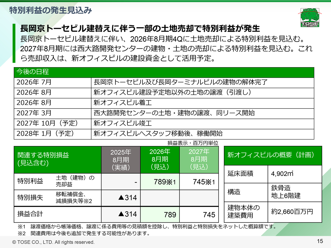 前期よりお知らせしていますとおり、当社が京都府長岡京市に有する、長岡京トーセビル及び隣接する長岡ターミナルビルの老朽化が進んでいたことからその2棟を解体し、新たなオフィスビル1棟を建設することを計画しています。それに伴い、2棟のビル解体後、新オフィスビル建設予定地以外の土地を売却することとしました。当該売却益の計上を2026年8月期に見込んでいます。