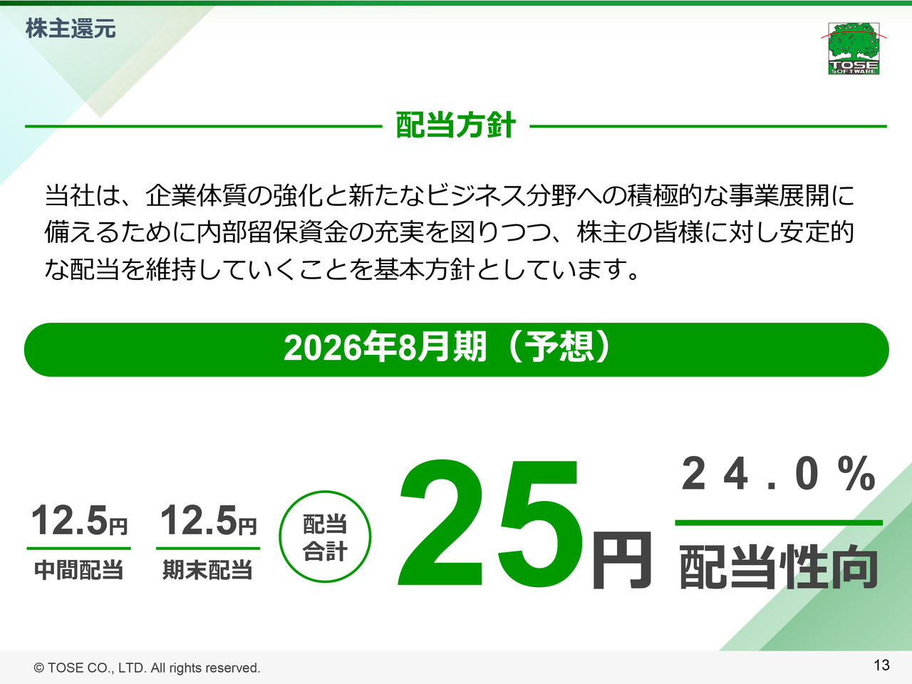 株主還元については、企業体質の強化と新たなビジネス分野への積極的な事業展開に備えるために内部留保資金の充実を図りつつ、株主のみなさまに対し安定的な配当を維持していくことを基本方針としており、2026年8⽉期においても、年間配当⾦は25円を⽬指しています。