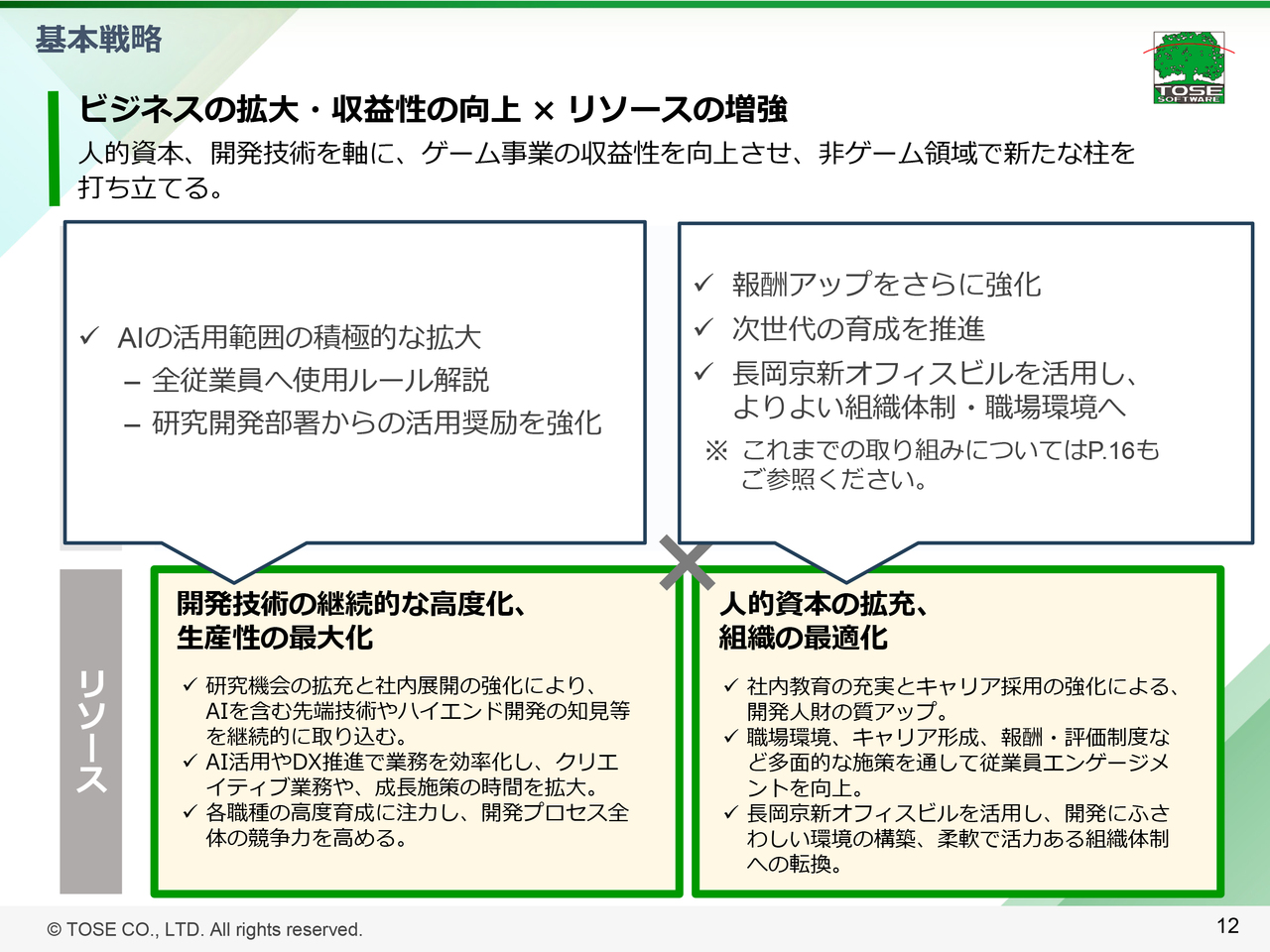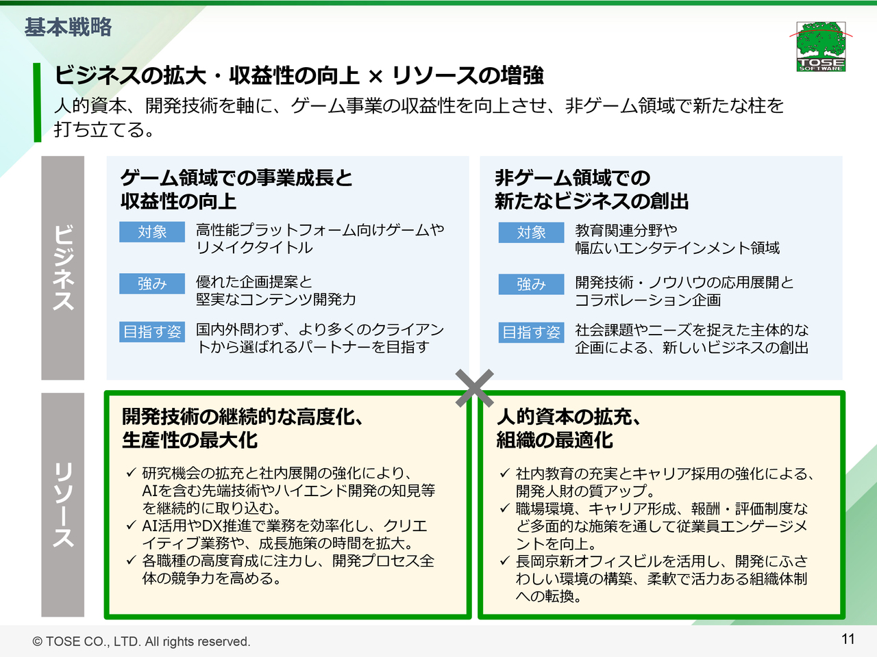 当社は、中期的な経営戦略として、ビジネス面では、ゲーム領域と非ゲーム領域の2つの方向性で取り組み、リソース面では、開発技術や生産性の向上及び、人的資本の拡充と組織の最適化に注力しています。ここではリソース面の取り組み状況をご紹介します。