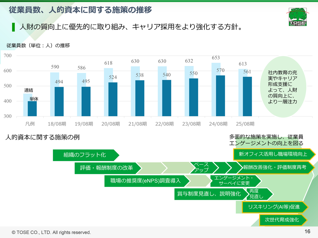 従業員数、⼈的資本に関する施策の推移については、スライド16ページのとおりです。