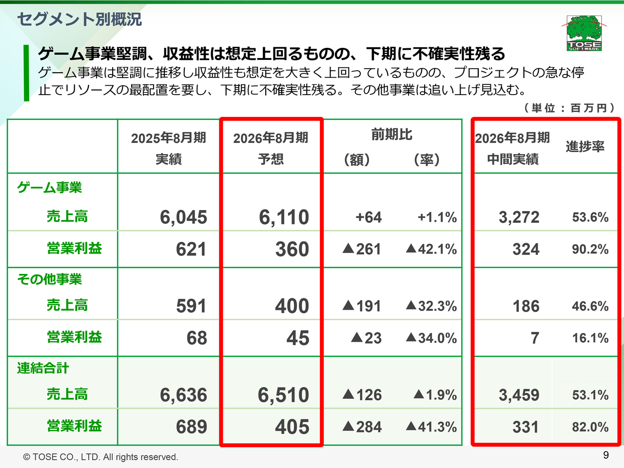 ゲーム事業については、当中間期の売上は堅調に推移し、収益性も想定を大きく上回ったものの、スライド8ページでご説明したとおり、プロジェクトの急な一時停止による稼働の空きへの対処と、当初より予定していた第3四半期以降の複数のプロジェクト移行が重なり、稼働の最適化を進めるにあたって不確実性が残る状況です。