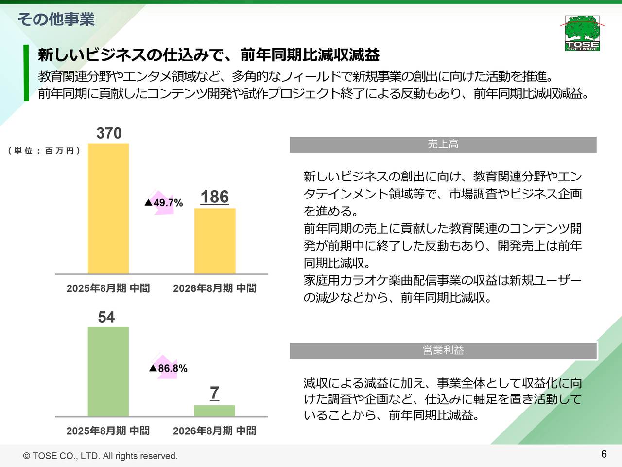 これらの結果、その他事業の売上高は前年同期に比べ49.7パーセント減少し1億8,600万円に、セグメント営業利益は前年同期に比べ86.8パーセント減少し、700万円となりました。