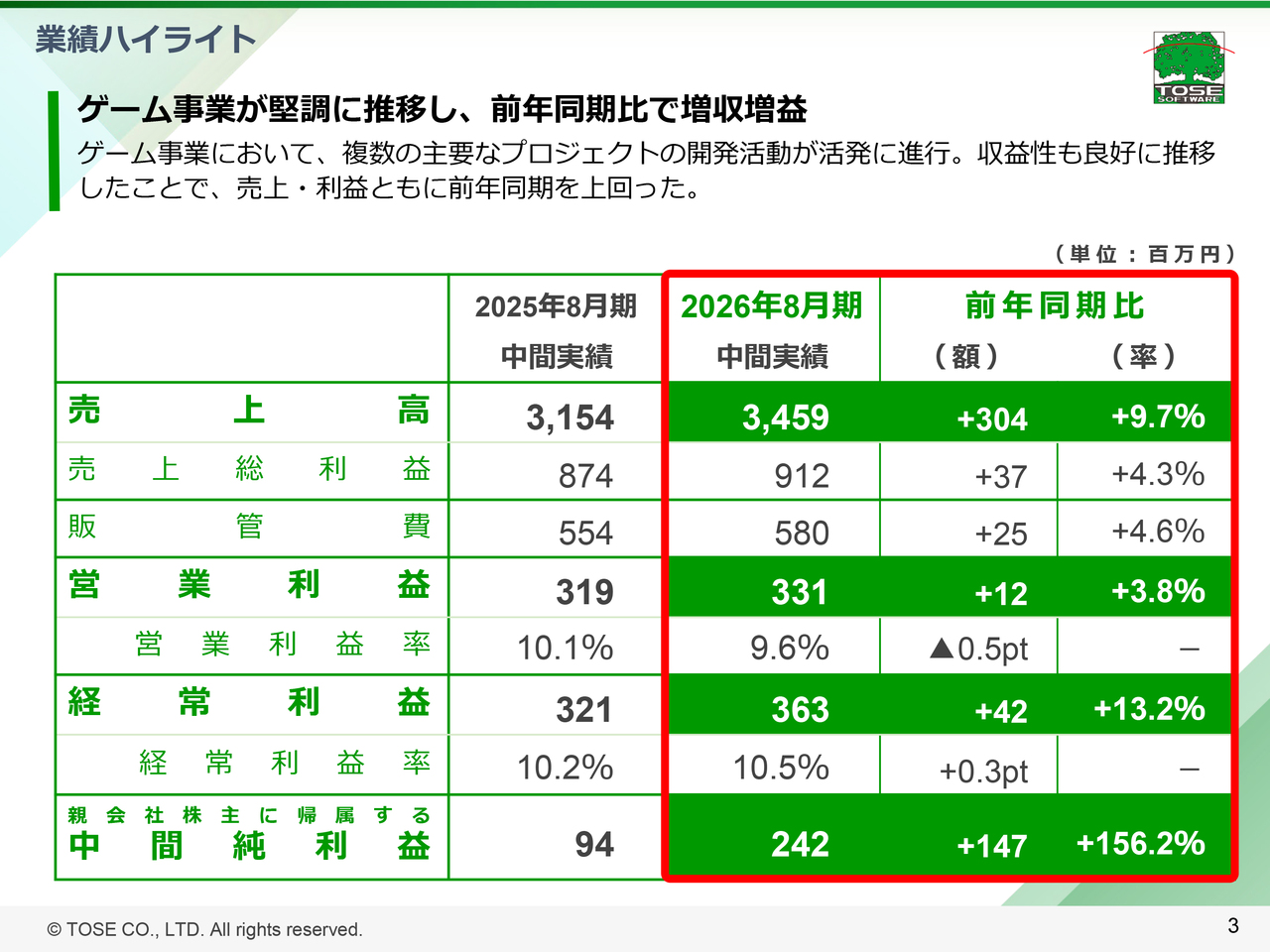 利益面については、ゲーム事業の主要な開発プロジェクトが概ね円滑に進行し、良好な収益性で推移したことから、営業利益は3億3,100万円、経常利益は3億6,300万円となりました。前年同期には、長岡京トーセビルの建替えに関連した、建物の減損損失やテナントの移転補償費用が特別損失として発生しましたが、当中間期はそのような損失がなかったことから、親会社株主に帰属する中間純利益は前年同期に比べ大幅に増益し、2億4,200万円となりました。